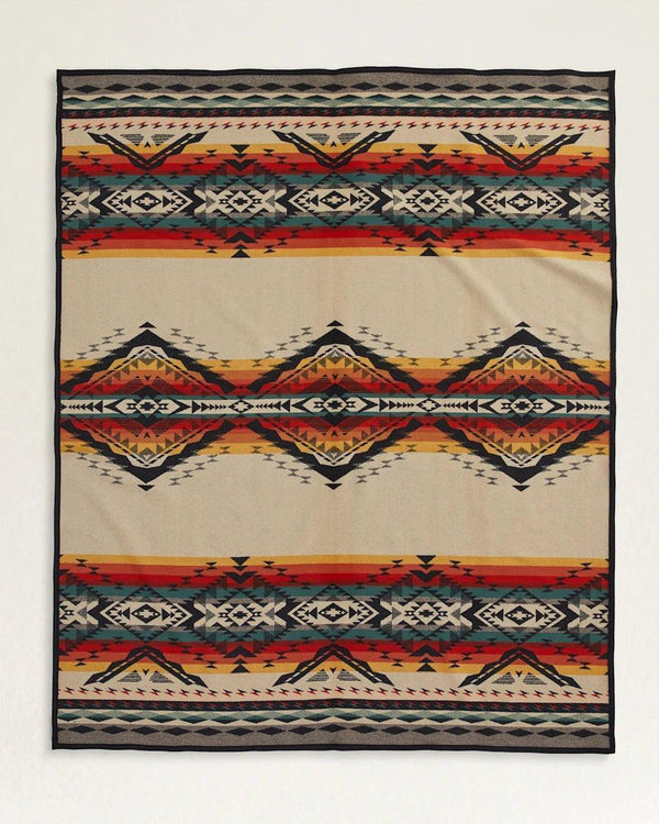 Passionately crafted in the USA, the Bridge Creek Twin Blanket features a captivating motif inspired by the mesmerizing landscapes of Mitchell, Oregon. The design embodies the diverse terrain of the town, from serene waterways to rugged hills, capturing its rich history and natural wonders. Each stitch intricately weaves layers of diamonds and zigzags, mirroring the vibrant hues and complex geology of the John Day Fossil Beds and the Painted Hills. Take home a piece of Mitchell's charm and embrace its beauty with this unique wool blanket.
