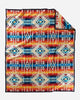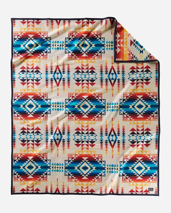 Rising above the scenery of Oregon's Western Cascades, Pilot Rock stands tall and proud, reaching high into the sky above the Rogue and Shasta Valleys. The Takelma, the original Native American inhabitants of the area, named it Tan-ts'at-seniphtha, which translates to "Stone Standing Up." The Takelma people lived in the shadow of the rock as they fished, hunted, and foraged along the Rogue River. This beautiful blanket is inspired by their way of life, with patterns of arrows symbolizing salmon swimming into nets, and large baskets brimming with abundance from the land, such as acorns and camas. Expertly woven in the Pacific Northwest, this twin/robe size blanket is the perfect addition to any bedroom, living room, or even as a stunning wall hanging.