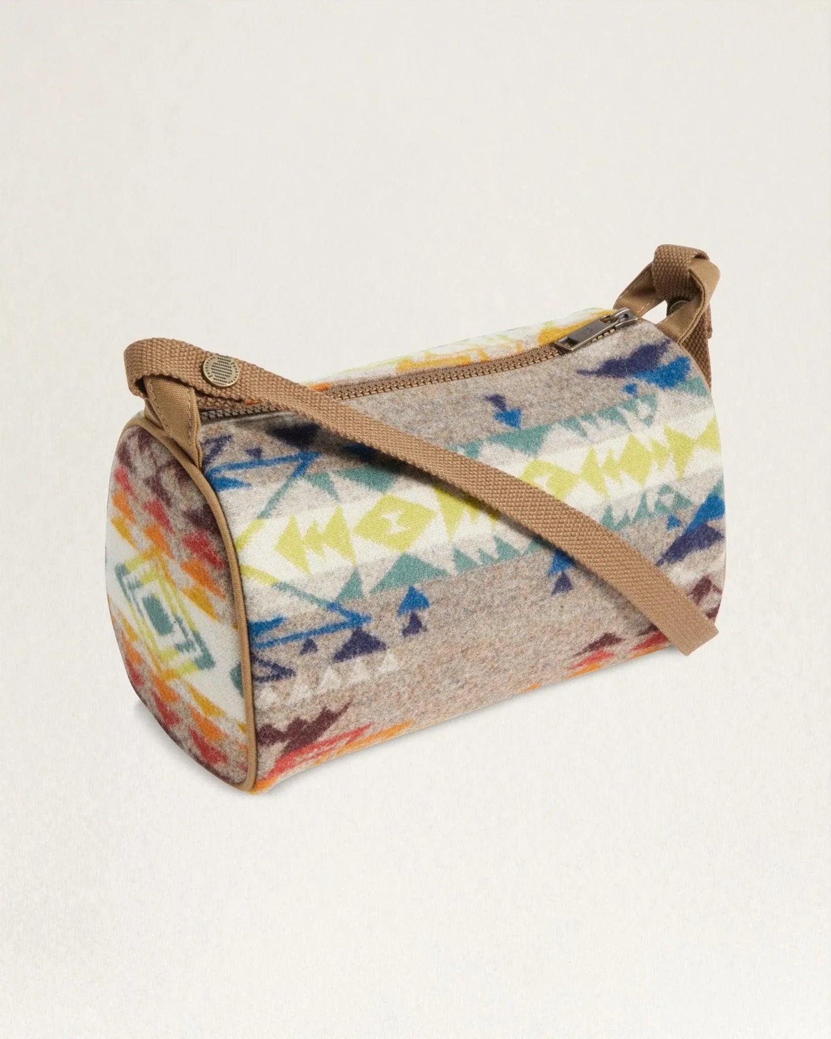 This versatile bag is made of wool jacquard and can serve as a shoulder bag, toiletry kit, or small accessory holder. It boasts a zip closure, an interior zip pocket, a leather logo patch, and a detachable canvas shoulder strap. Its antiqued brass hardware adds to its luxurious appeal. The pattern placement may vary.