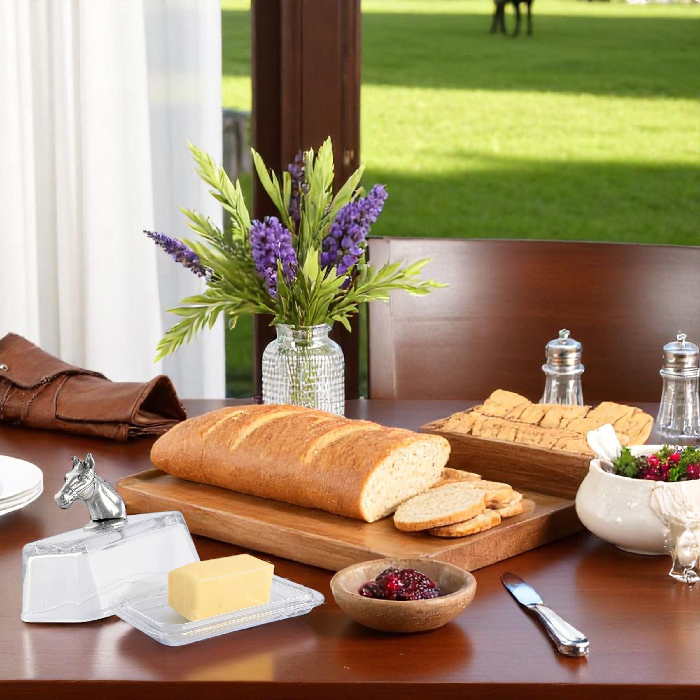 This Horse Head Glass Butter Dish brings Western charm to your table with its detailed horse head design and durable glass construction. Perfect for any occasion, it's a stylish way to serve butter while adding a touch of elegance to your tableware collection.