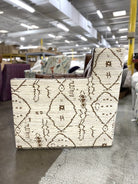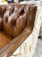 Elevate your living room with the Mesa & Leather Sofa, blending rustic southwestern charm with refined luxury. Designed with light brindle hair-on-hide, supple Longhorn Oatmeal base leather, floral brown sugar embossed leather, brass nail accents, and distinctive southwest Mesa-patterned fabric, this sofa brings warmth and sophistication to any rustic home or lodge setting.