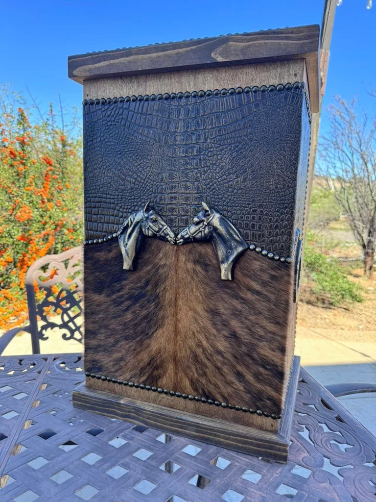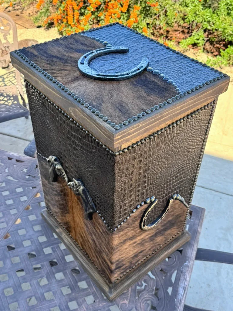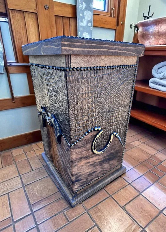 Enhance your living area with our Leather and Wood Storage Bin, thoughtfully crafted for admirers of rustic sophistication. Made in the USA, this piece combines practicality with western-inspired style. Choose from a variety of bespoke leather and cowhide finishes to suit your unique taste.