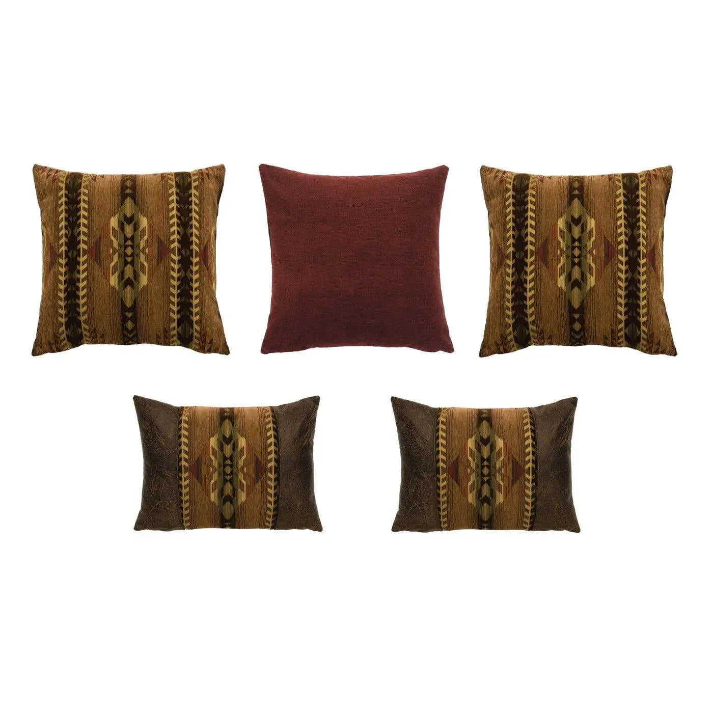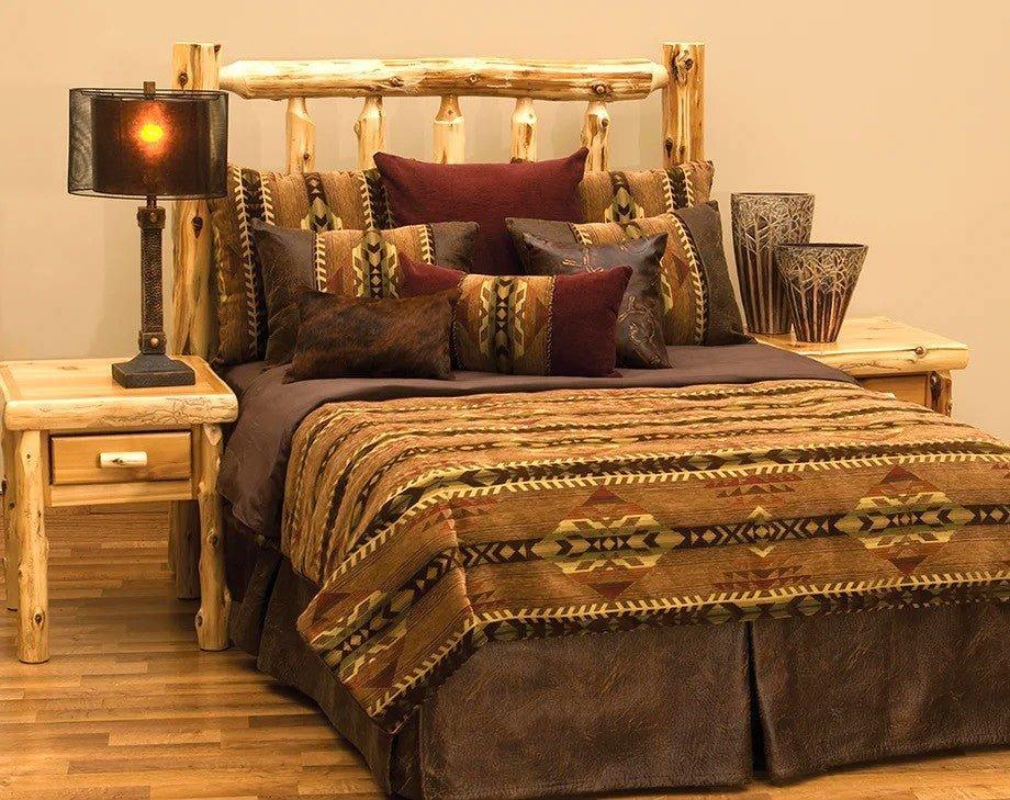 Our Winslow Southwestern Duvet Set is made with chenille fabric in rich shades of brown, red, and gold, accented by durable faux leather in colt coffee color. The featured set also includes a rustic dark brindle hair on hide accent pillow and embossed leather brands pillow. Made in the USA with premium 100% Polyester, this Southwestern Bedding offers the ultimate softness and comfort.