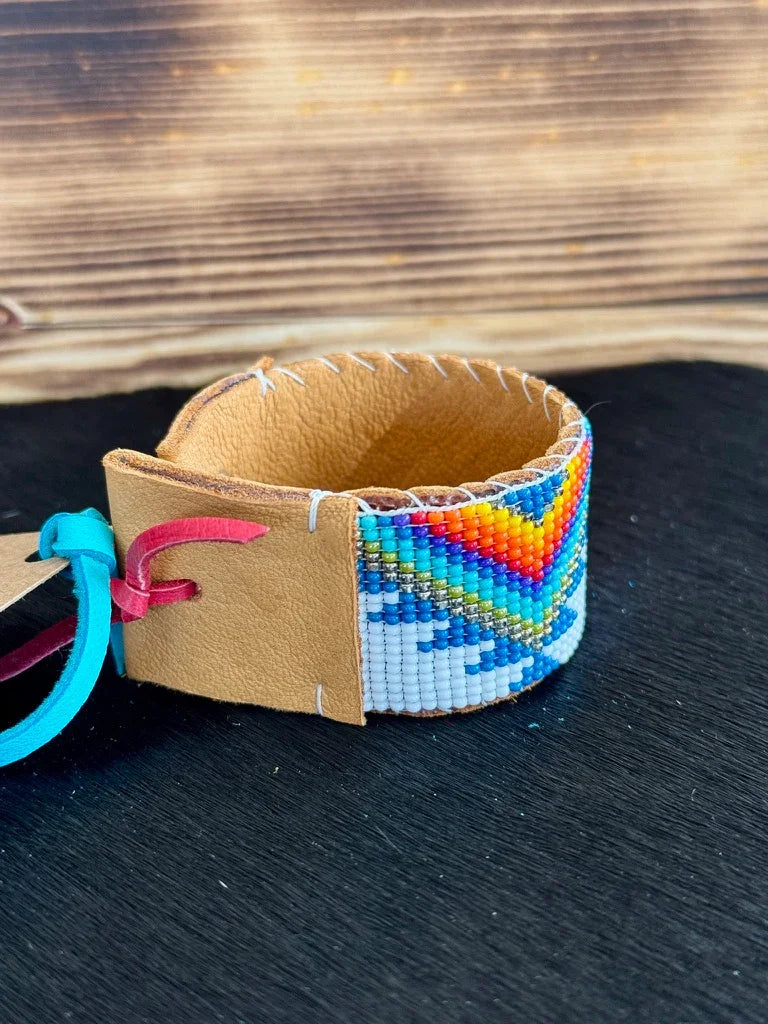 Add a pop of colors to your wrist with our Red & Blue Mountains Bracelet. This hand loom crafted bracelet features a rainbow triangular pattern on a white background. Handmade in the USA, this beautiful piece adds a touch of Western charm to your jewelry collection.
