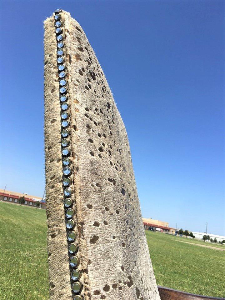 Wrapped in striking gold metallic acid-washed cowhide, this chair captures light and attention from every angle. Sparkling rhinestone nail trim adds a touch of refined bling, while the smooth honey brown leather seat provides rich contrast and luxurious comfort. It’s the perfect balance of cowgirl confidence and upscale Western elegance.