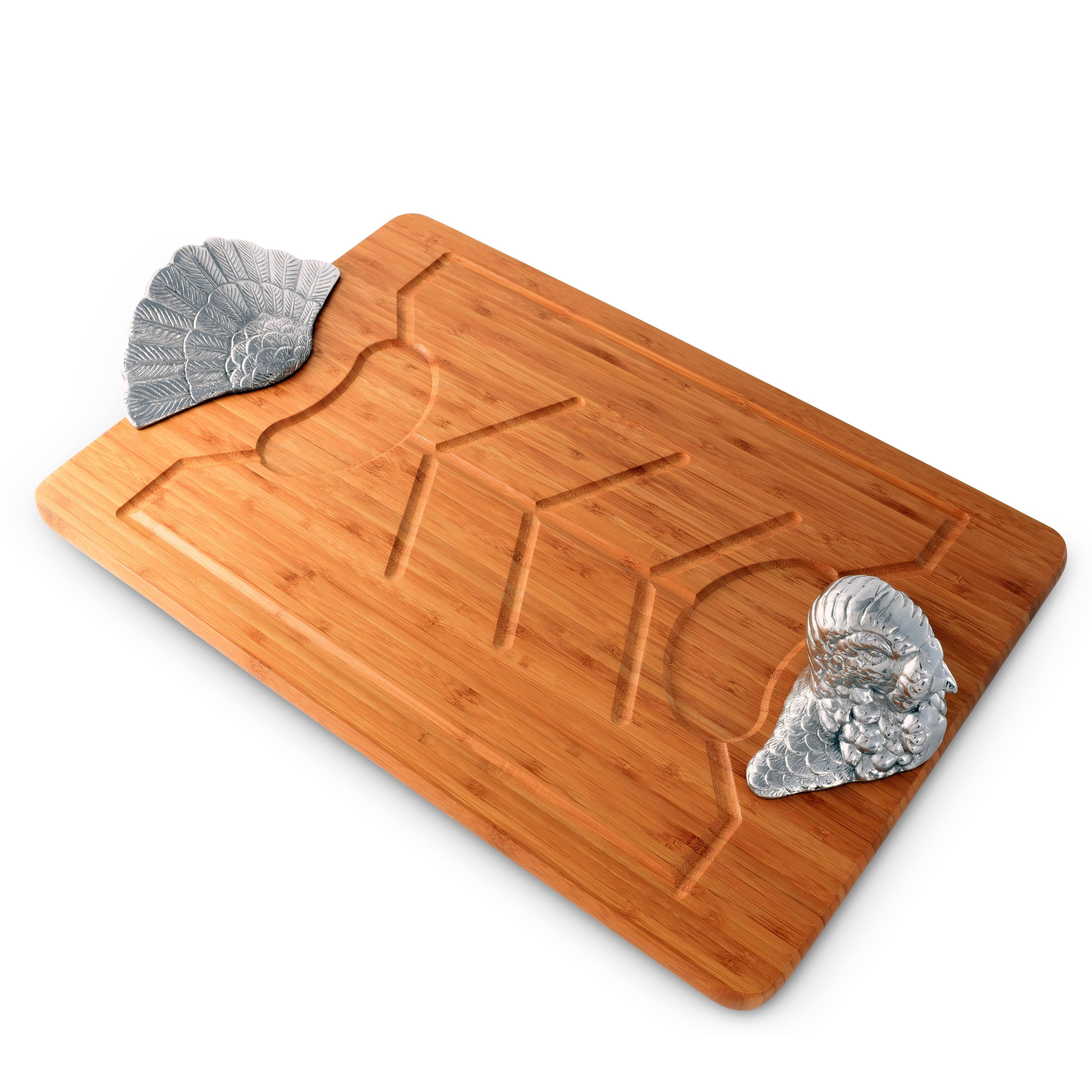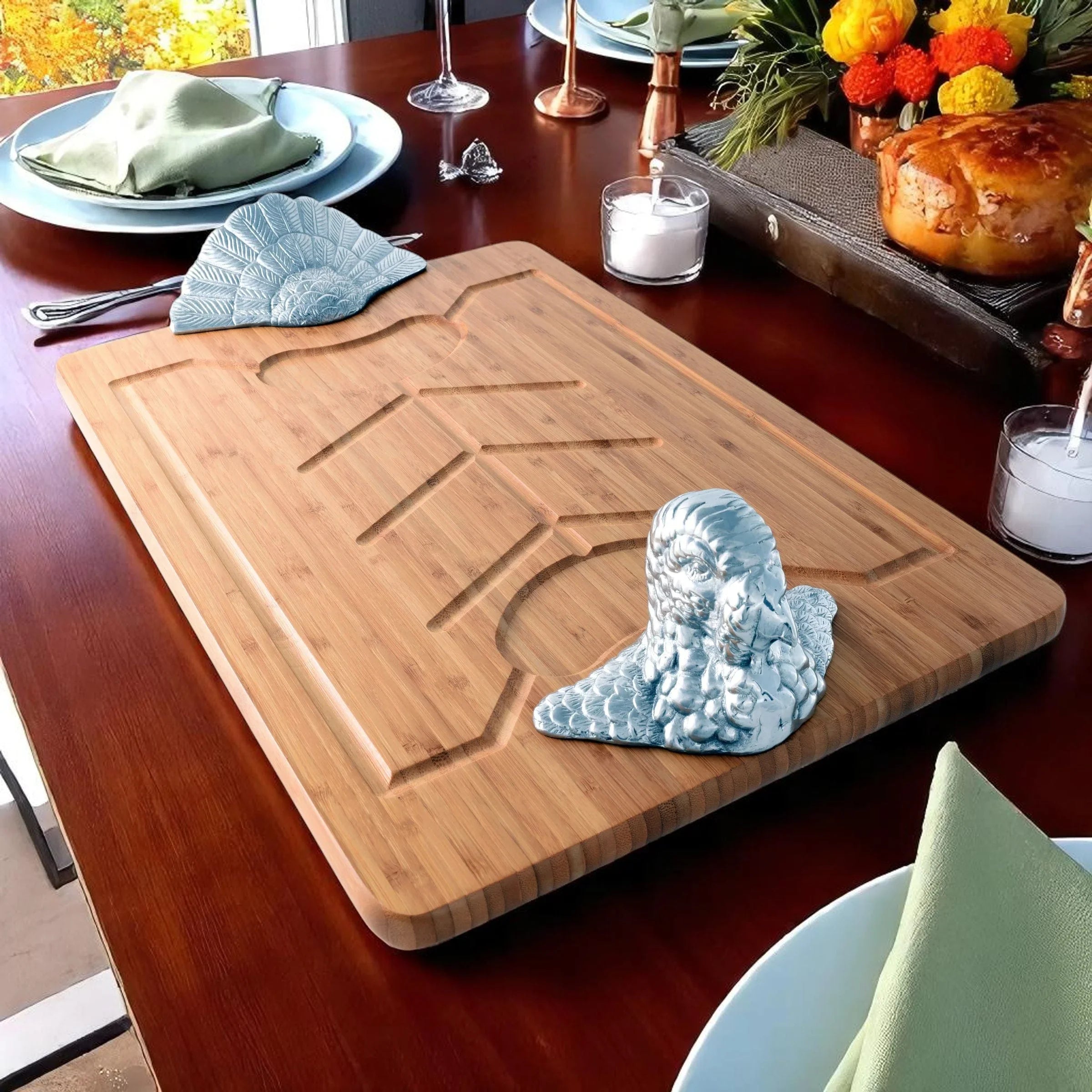 Bring rustic elegance to every meal with this handcrafted bamboo carving board, complete with distinctive detailed turkey handles that capture authentic woodsy charm. Sustainably sourced bamboo construction ensures durability while deep juice wells keep your table pristine during carving. Perfect for holiday gatherings and everyday entertaining, this statement piece transforms your kitchen into a showcase of style and function.