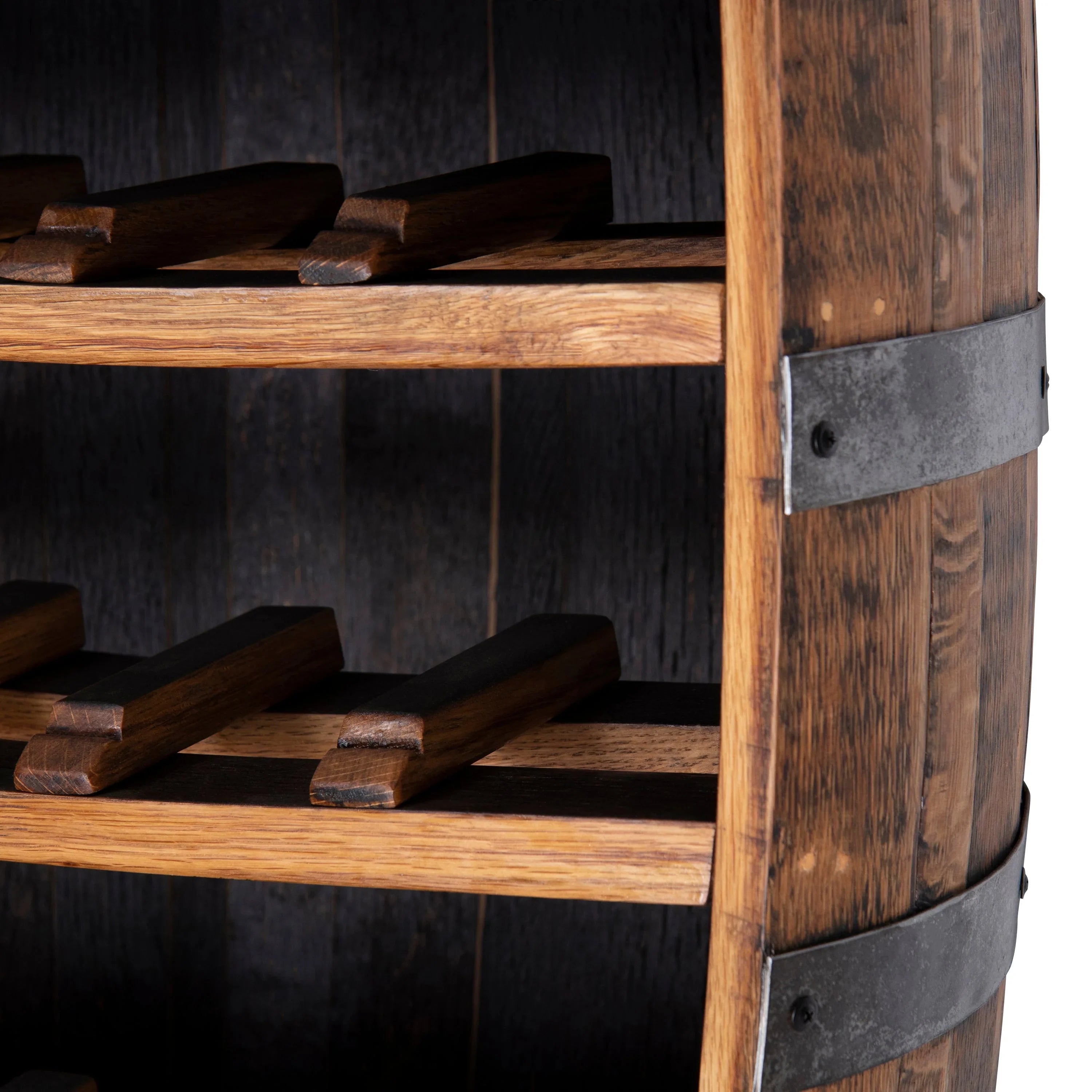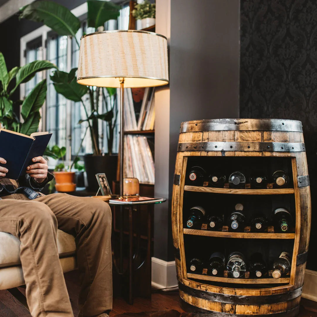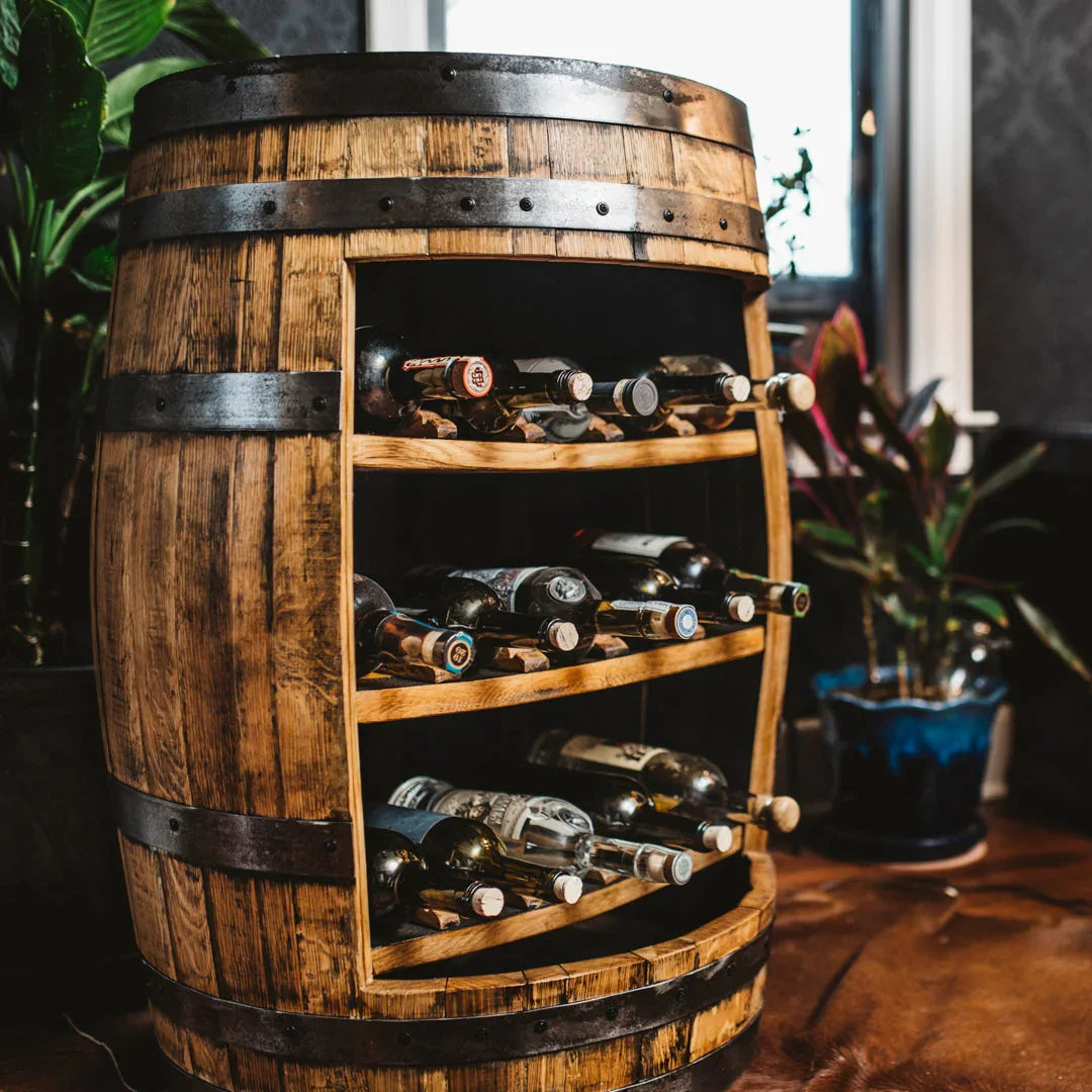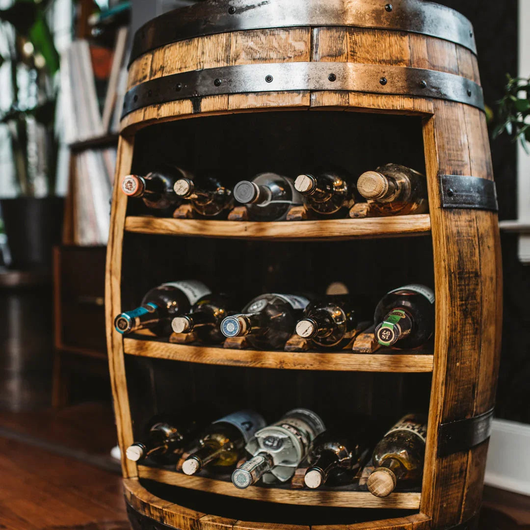 Transform your cluttered space into an organized and stylish showcase with our open-concept barrel wine rack. Made from authentic whiskey-aging barrels from Michigan distilleries, each handcrafted wine cabinet adds a touch of rustic charm while providing a functional and decorative storage solution. Say goodbye to overflowing countertops and let your fine (or not-so-fine) bottles shine in their new home!