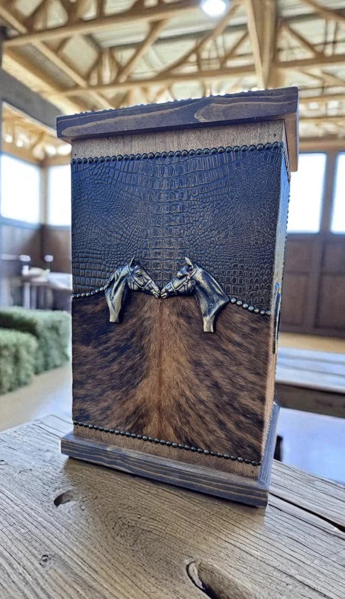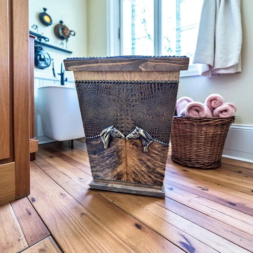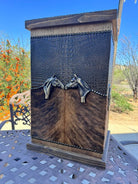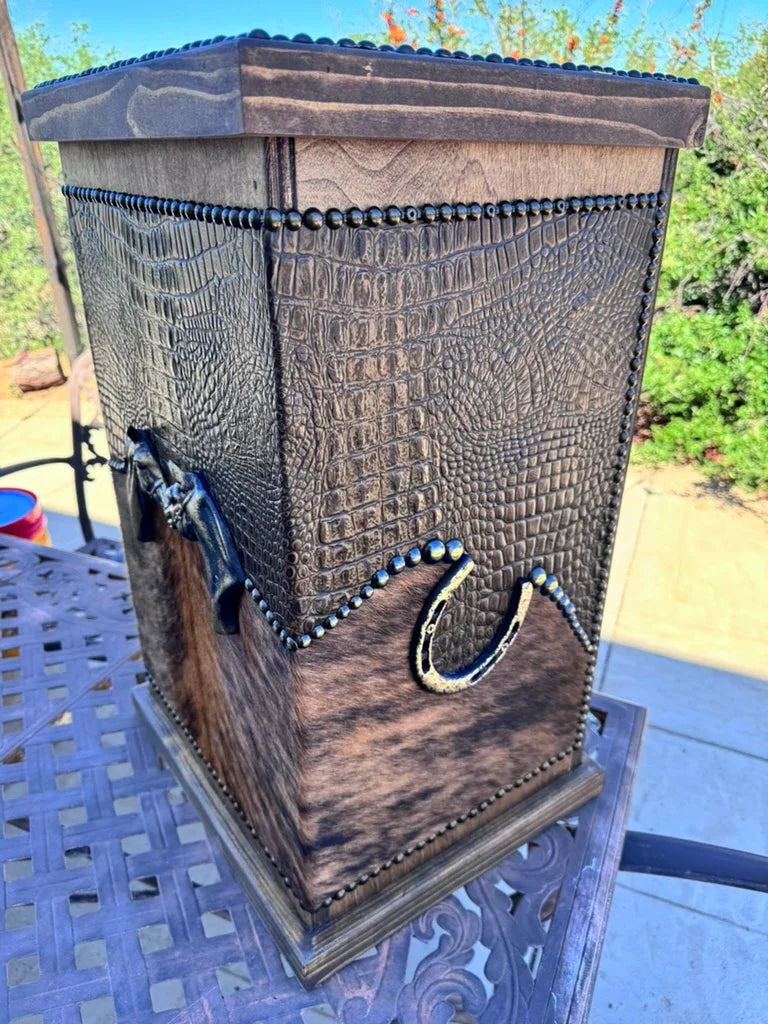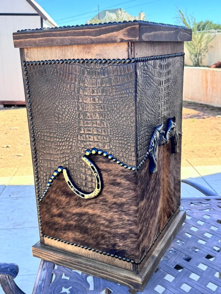 Enhance your living area with our Leather and Wood Storage Bin, thoughtfully crafted for admirers of rustic sophistication. Made in the USA, this piece combines practicality with western-inspired style. Choose from a variety of bespoke leather and cowhide finishes to suit your unique taste.