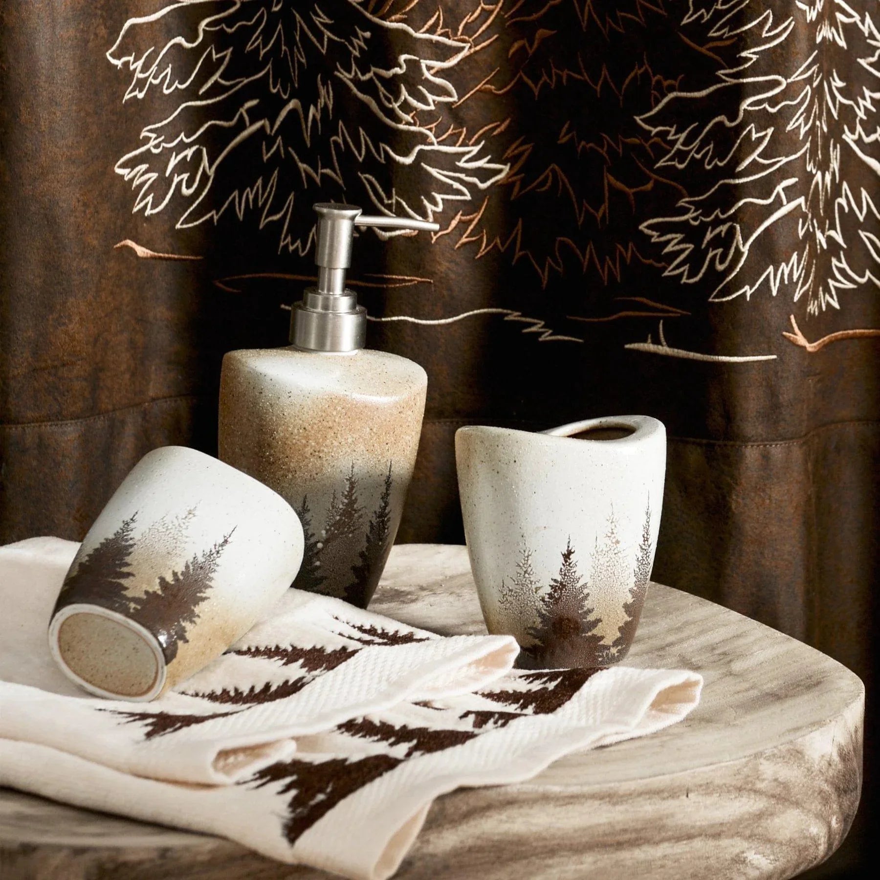 Recalling the majestic scene of a winter-touched forest, our Mystic Pines Bathroom Set evokes a rustic charm to your washroom. Inspiring a cozy cabin feel, its warm palette of chocolate brown, cream, and mocha is accented by light paint flecks to give each piece a homespun pottery feel. This set includes a ceramic tumbler, toothbrush holder and soap/lotion dispenser.
