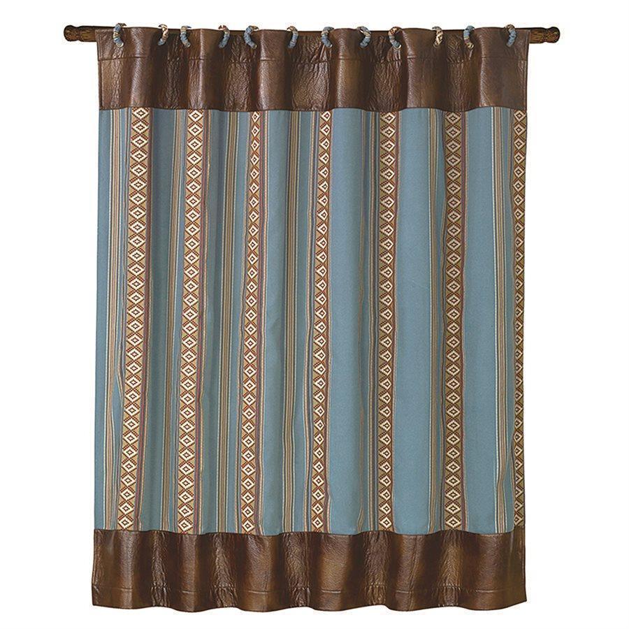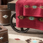 Bold and beautiful geometric patterns are the focus of this look. Rich red, turquoise and mustard striped shower curtains pair beautifully with Navajo embroidered plush towels. The Aztec 9 piece lifestyle bathroom collection includes Aztec striped faux leather shower curtain w/ fabric covered rings, 3-piece embroidered bath towel set, bath rug, and 4-piece Navajo bath countertop accessory set. Items featured in our collections can be purchased separately.