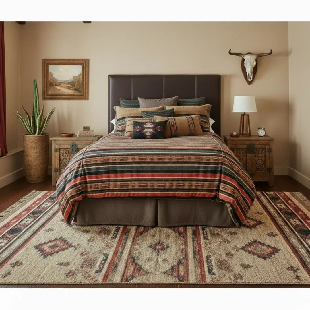 Transform your bedroom with the elegant Sun Valley Mojave set, where classic rustic appeal meets modern resilience. Showcasing a sophisticated mix of tan, cream, brown, black, red, and blue-grey hues, this collection captures the enduring spirit of the American Southwest. Its strong geometric designs and natural shades create a welcoming atmosphere, making it a refined focal point for any sleeping space.