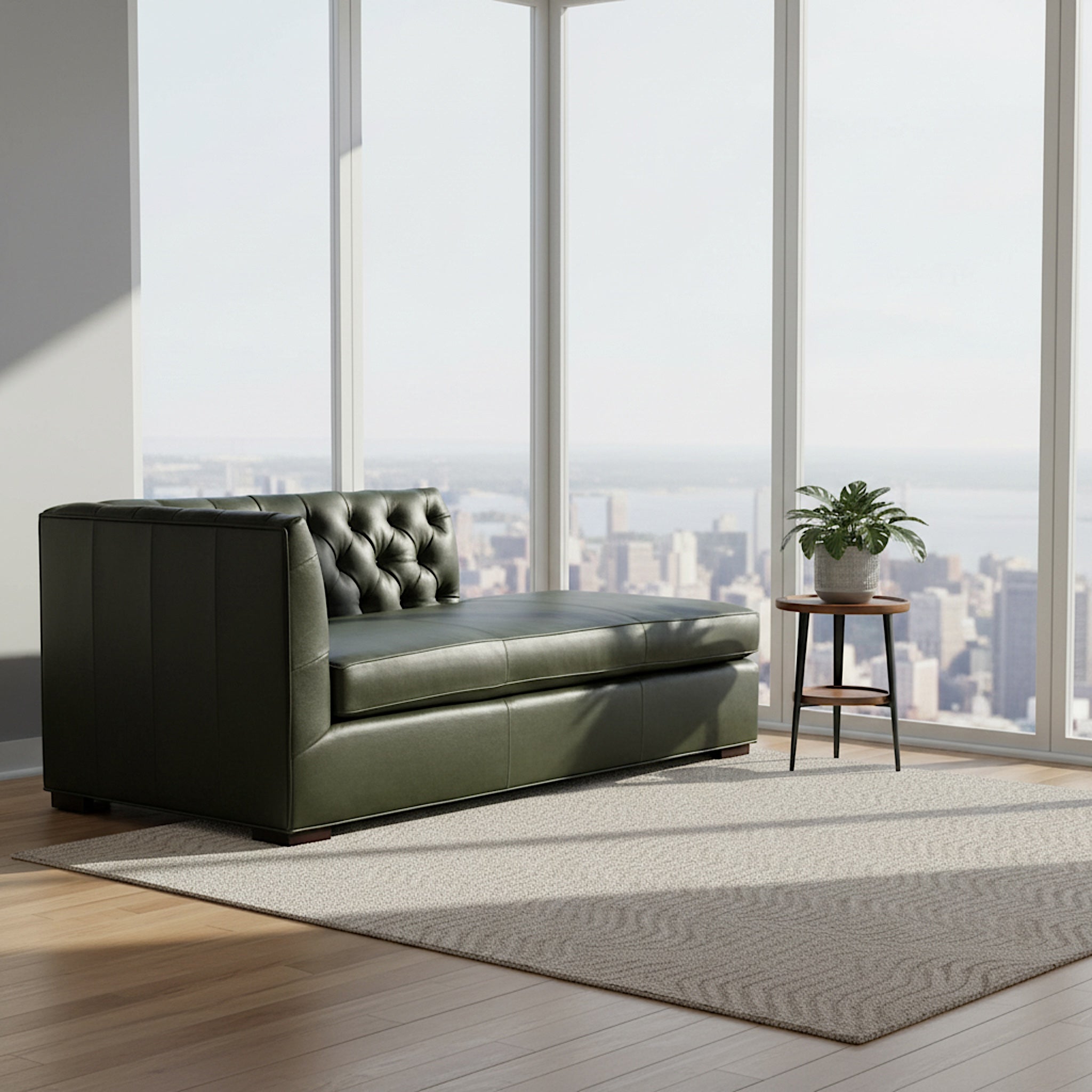 Commanding yet refined, the Ambrose Emerald Tufted Leather Daybed is a statement in tailored comfort and American craftsmanship. Designed with a fully padded, diamond-tufted back and clean architectural lines, this piece brings both structure and softness to sophisticated interiors.