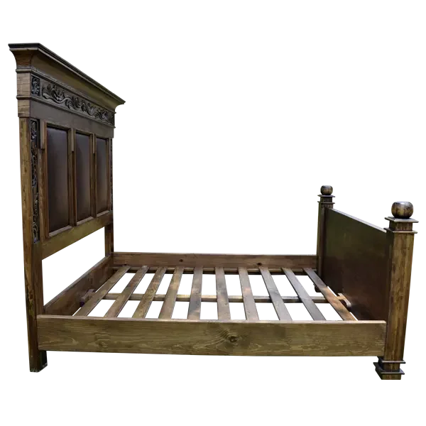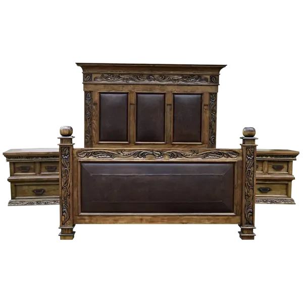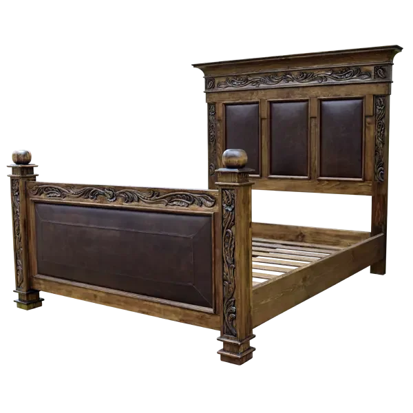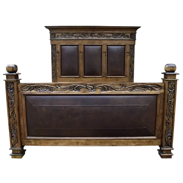 The top of the footboard is embellished with graceful, hand carved, floral and scroll designs. The front of the footboard has a wide, rectangular, padded panel, and the panel is covered with matching, dark, brown, full grain leather. The junctions of the leather are double stitched together for extra strength and durability. The footboard is framed on each side by dramatic, solid wood uprights, and the face of each upright is accented with ornate, hand carved, floral details. The top of each side upright is enhanced with a hand carved sphere, followed by geometric, hand carved details. The bed has solid wood, side supports, and it rests on geometric shaped, solid wood legs.