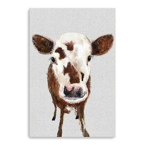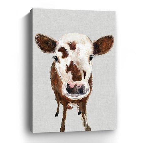 Stretched over a natural pinewood frame, this canvas wall art will give this adorable big head baby cow a chance to bring life to your space.