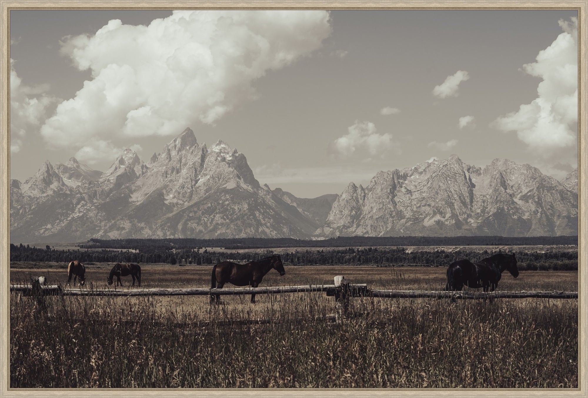 Experience the breathtaking beauty of our Wild West Legends Canvas Horse Art - a super sized giclee that will elevate any space. This captivating art captures the essence of these majestic horses on an open range, from the intricate details of the weeds to the jagged mountain peaks. Perfect for western, rustic, ranch, or farmhouse themed rooms, this must-have piece.