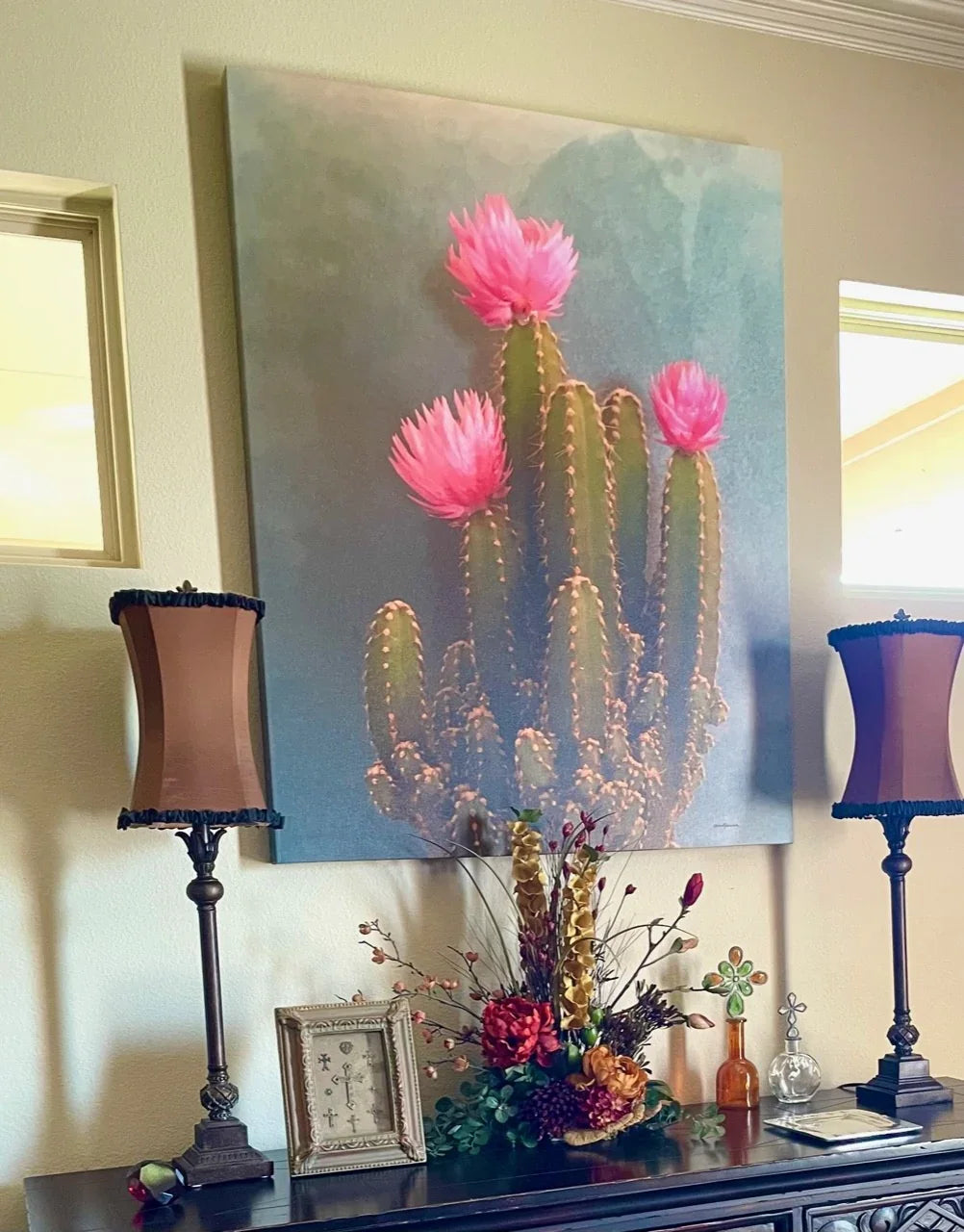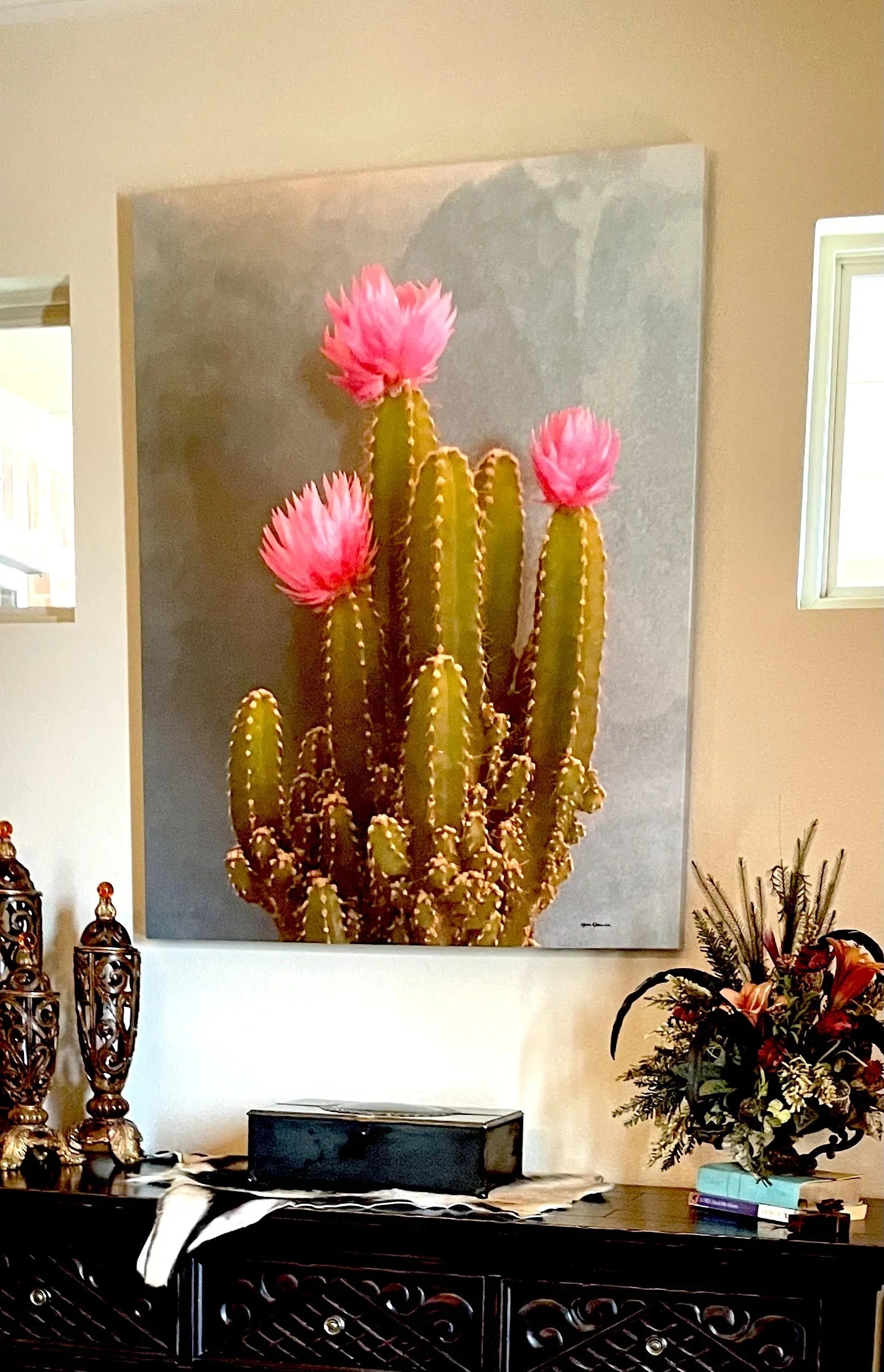 Bring the spirit of the Southwest into your living space with the Pink Passion Canvas Art. Showcasing a Hedgehog cactus adorned with vivid pink blossoms, this signed giclee canvas by artist Sherri Alexander adds a lively and authentic touch to your décor.