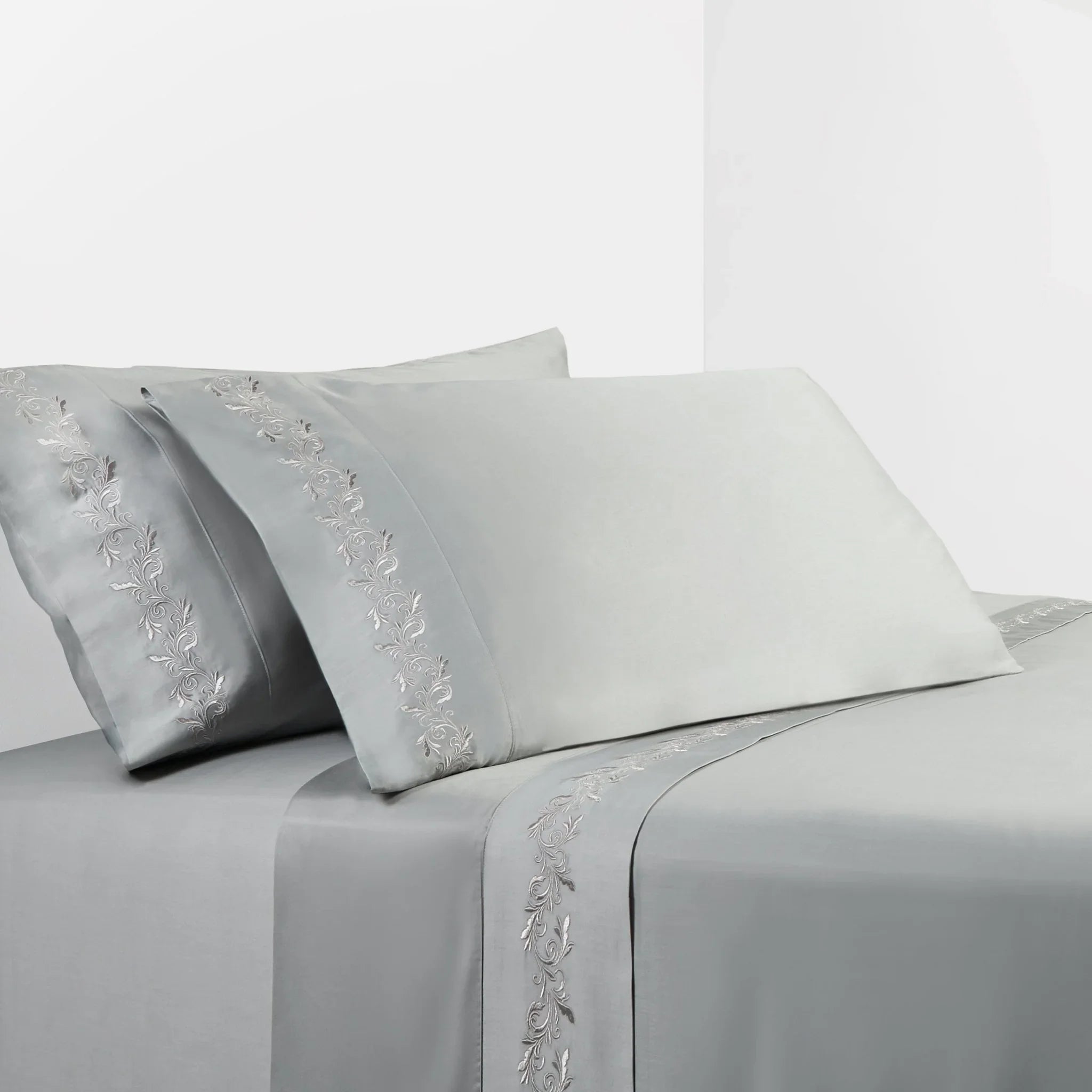 This set of silky sheets features a beautiful, intricate scroll embroidery for added elegance and sophistication for your bedding. The 350TC adds to a satin like softness for comfort and style. Elevate your sheets experience with this gorgeous four piece sheet set that will lend luxury and refinement to your bedding ensemble. Queen & king sheet sets are available in a crisp white w/ gray embroidery or silky gray w/ gray embroidery. Imported.