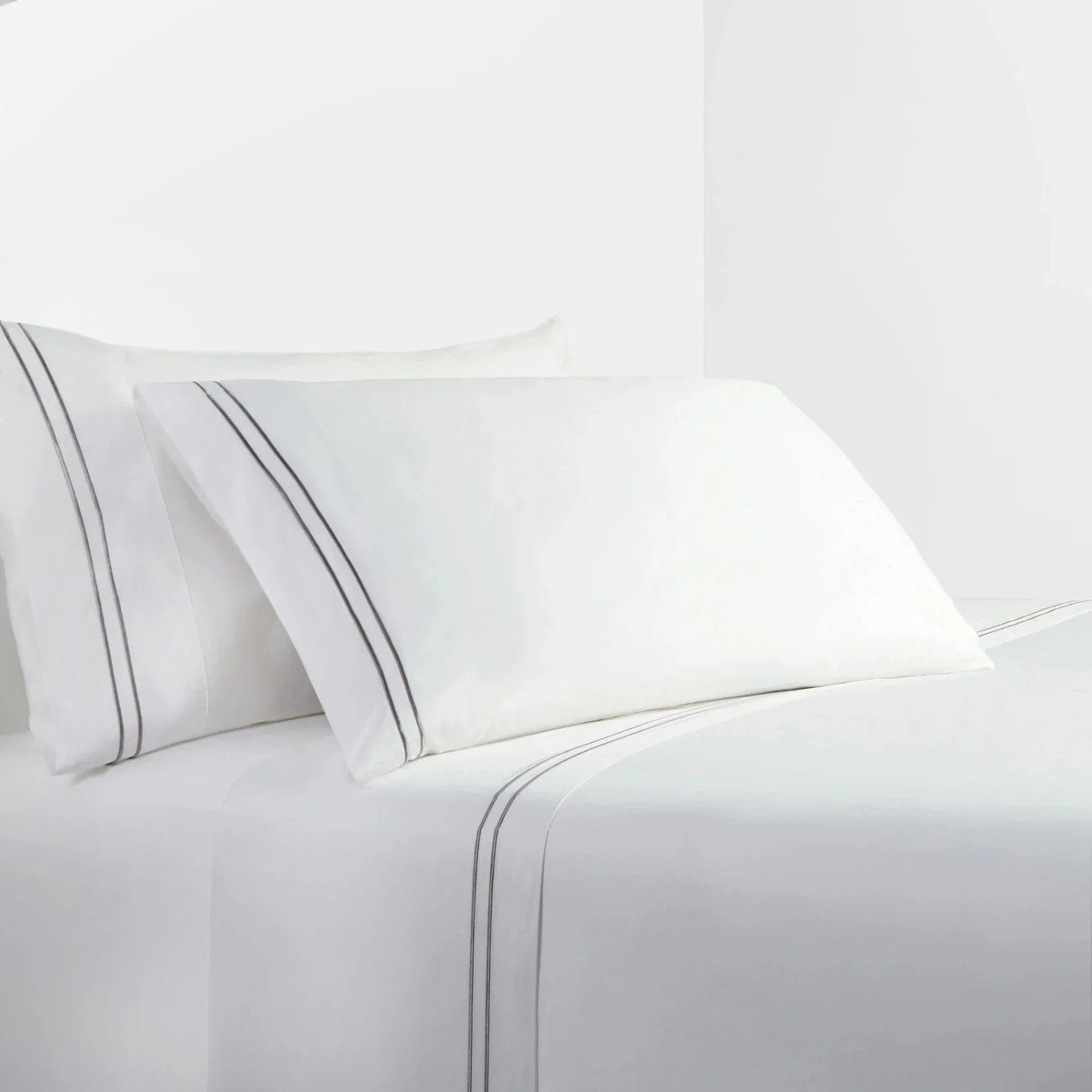 Indulge in ultimate comfort and style with this luxurious four piece sheet set. Featuring raised grey embroidery on crisp white fabric, these sheets exude sophistication and versatility. The 350TC adds a silky softness to your bed, elevating your bedding ensemble to refined luxury.