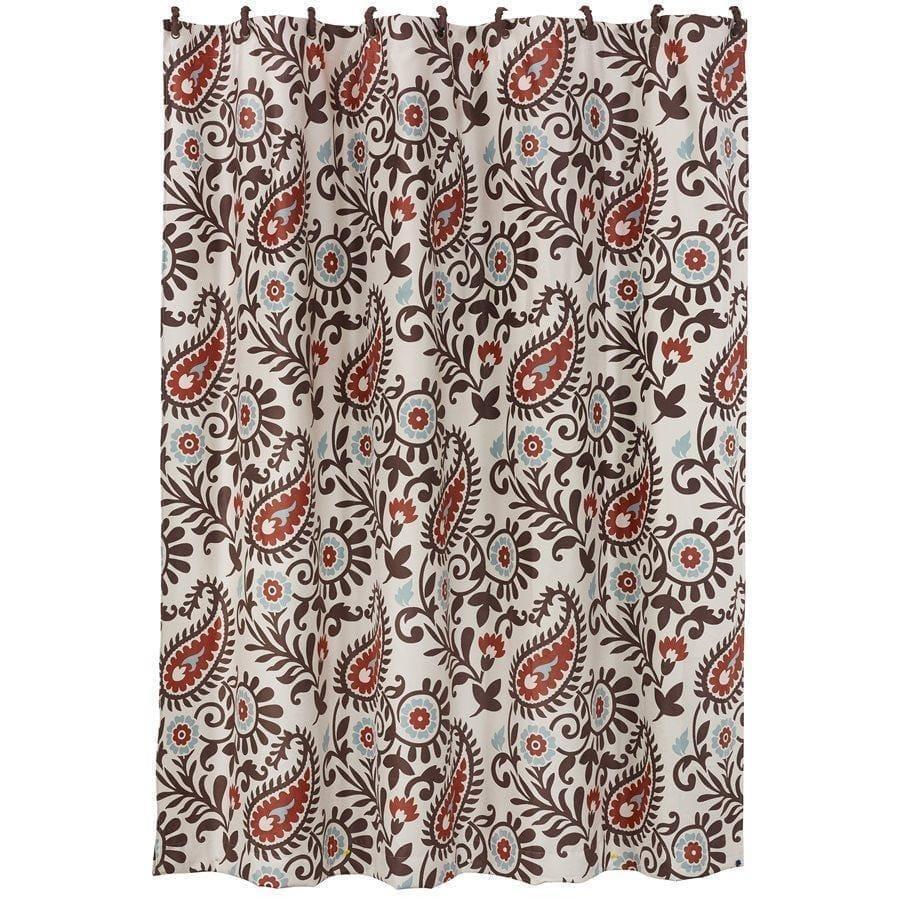 Invigorate your bathroom with our luxurious 9-piece Rebecca Paisley Bath Collection. This collection features a striking paisley shower curtain with fabric covered rings, a cream-colored 3-piece embroidered bath towel set, a plush paisley bath rug, and a 4-piece Savanna bath countertop accessory set in cream. Each item in this collection can be purchased individually, allowing you to create a custom and sophisticated bathroom experience.