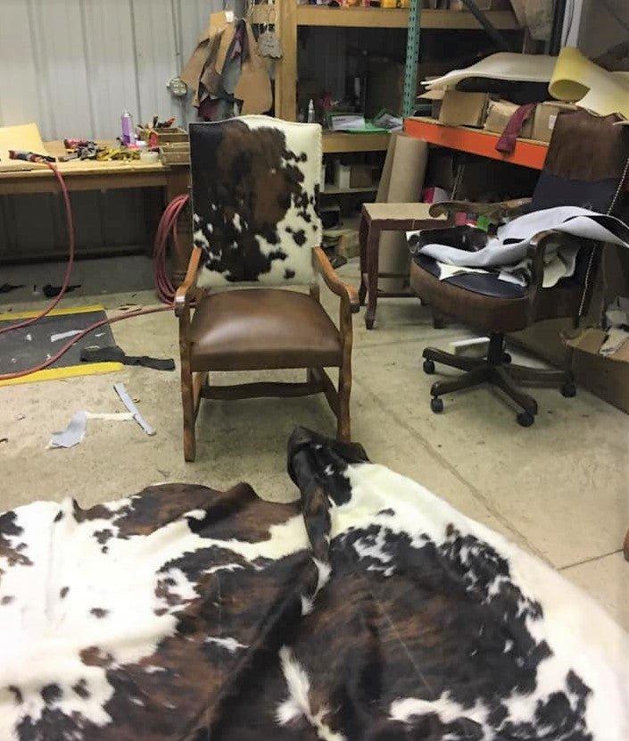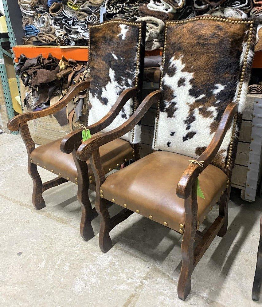 These dining chairs boast an embossed leather with a cowboy tool pattern with shimmering hints of metallic bronze highlights giving a profound, rich color that flickers to the surface through its multiple layers of finishing waxes. To complete the chair, a hardwood frame and a premium high-density foam cushion core provides lasting durability and comfort for everyday use. Best as a dynamic set, these dining chairs are hand made classics just for you.