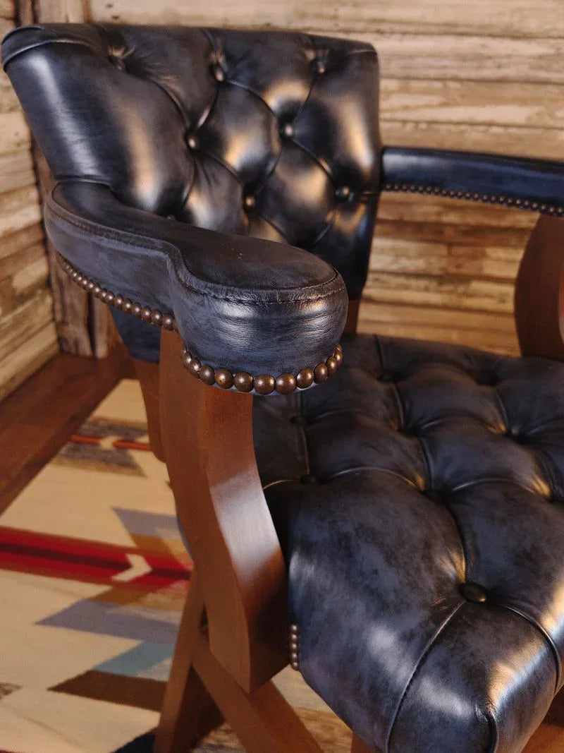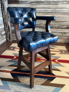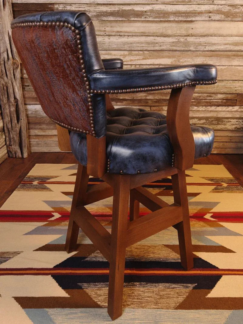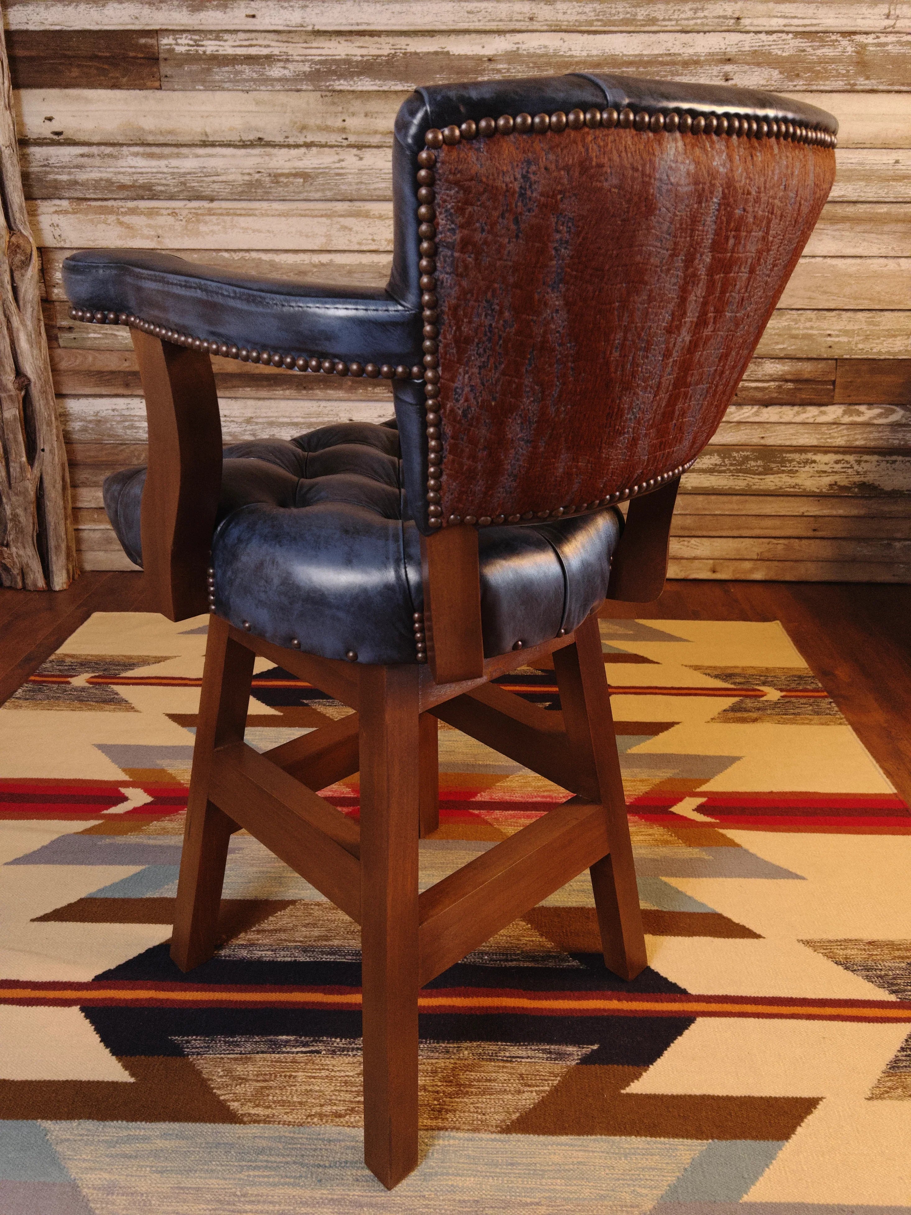 Discover Western luxury redefined with this handcrafted Burnished Blue Leather Barstool. The 360-degree swivel combines practicality with authentic style, while distinctive hair-on-hide backing and hand-tufted deep blue leather deliver unmatched character. Made in the USA with meticulous attention to detail, this premium barstool merges rugged sophistication with refined comfort. Invest in seating that commands attention and stands the test of time—where bold design meets exceptional craftsmanship.