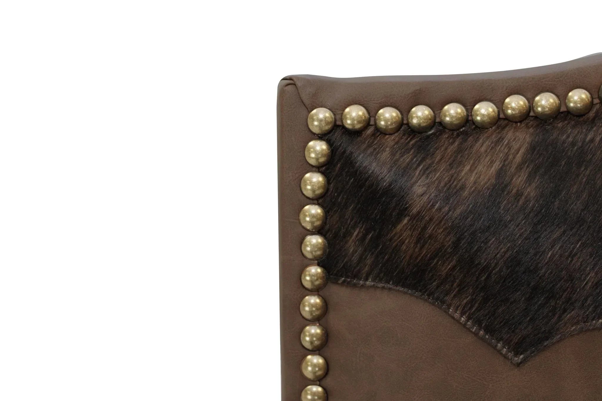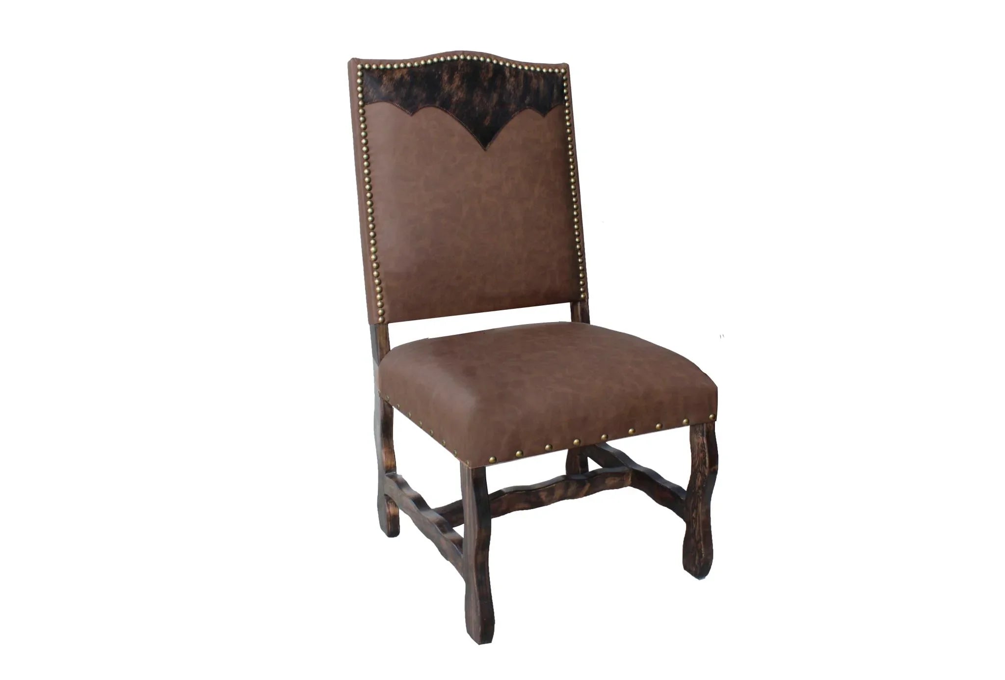 Elevate your dining experience with the Cognac Armless Dining Chair, featuring smooth, genuine brown leather and cowhide accent upholstery. Its detailed nail tacking adds a refined touch, while the natural dark-stained wood frame provides durable, timeless elegance. This chair blends comfort and style effortlessly, making it a perfect addition to any dining space.