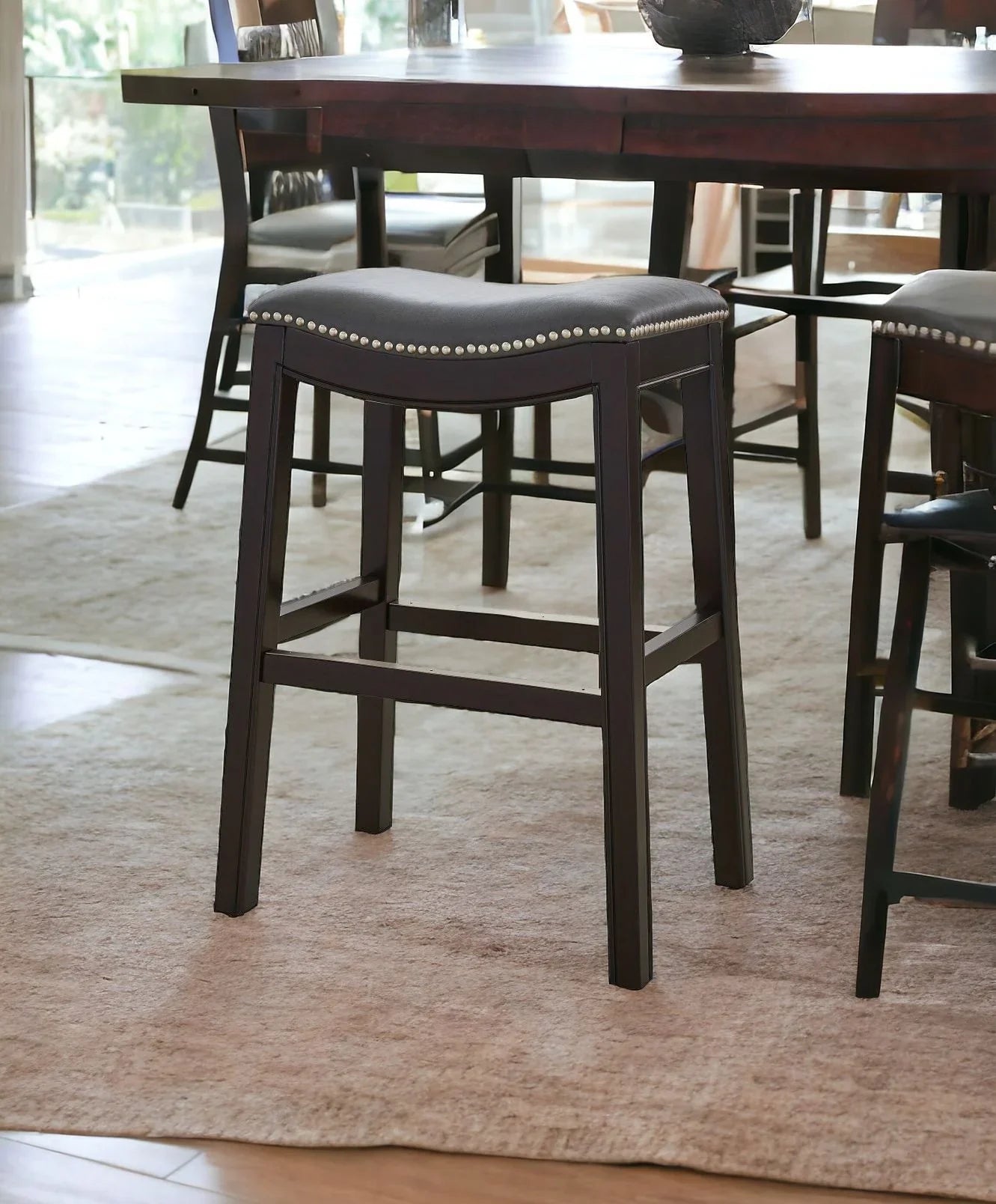 This rich dark finish counter height stool blends sturdy solid wood construction with soft cushioned faux leather seating that is complimented by nail head details.