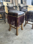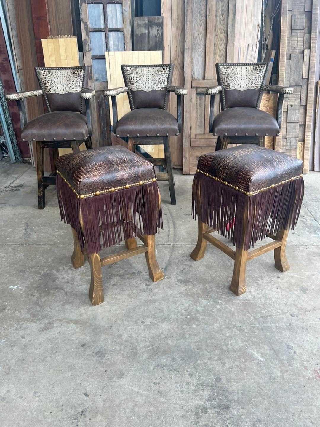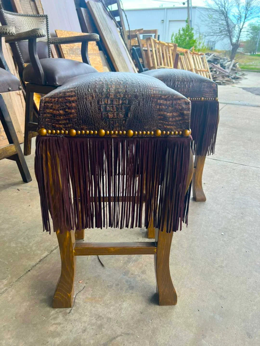 Introduce refined western elegance to your home or bar with the Laredo Leather Western Stools. Offered in four heights to accommodate dining, counter, and bar settings, these stools showcase a croc-embossed leather seat, detailed large and small nail trim, and extended leather fringe, capturing the essence of timeless western style.