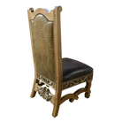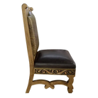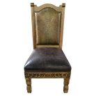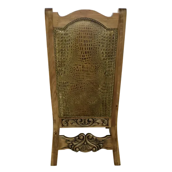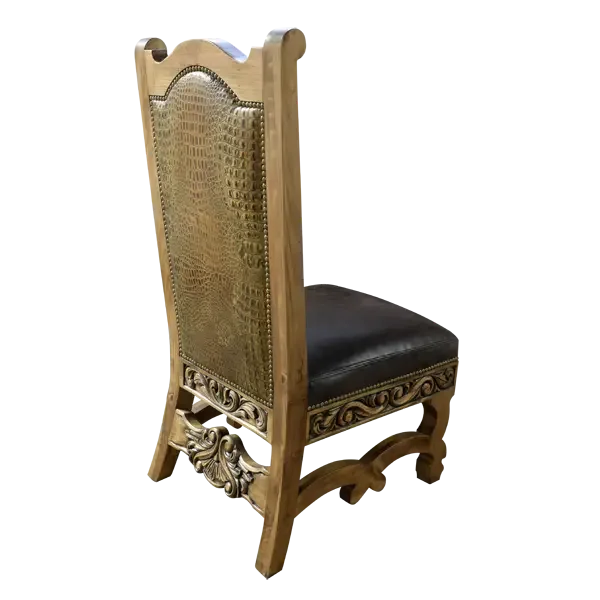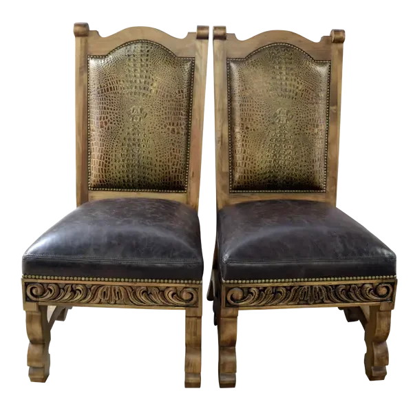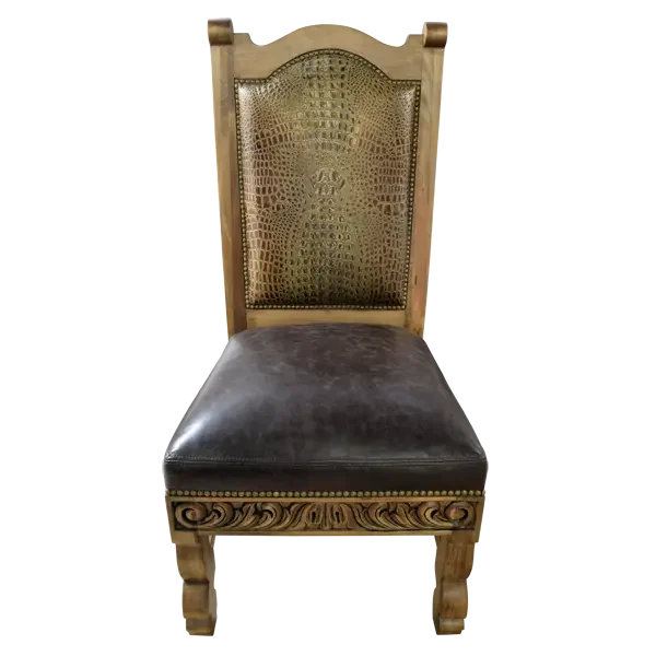 Experience ultimate comfort and style with this handcrafted Croc Western Side Chair. Its plush seat is covered in luxurious brown full-grain leather, while the backrest features both sides upholstered in striking, crocodile-patterned embossed leather. Expertly hand-tacked with decorative nails, the leather complements the beautifully finished tall back with a graceful curved top rail. Intricate hand-carved floral designs adorn every side of the wood base, supported by elegantly curved front legs and subtly splayed back legs connected by curved side crossbars. Crafted from premium sustainable wood, this chair is fully customizable to suit your unique taste.