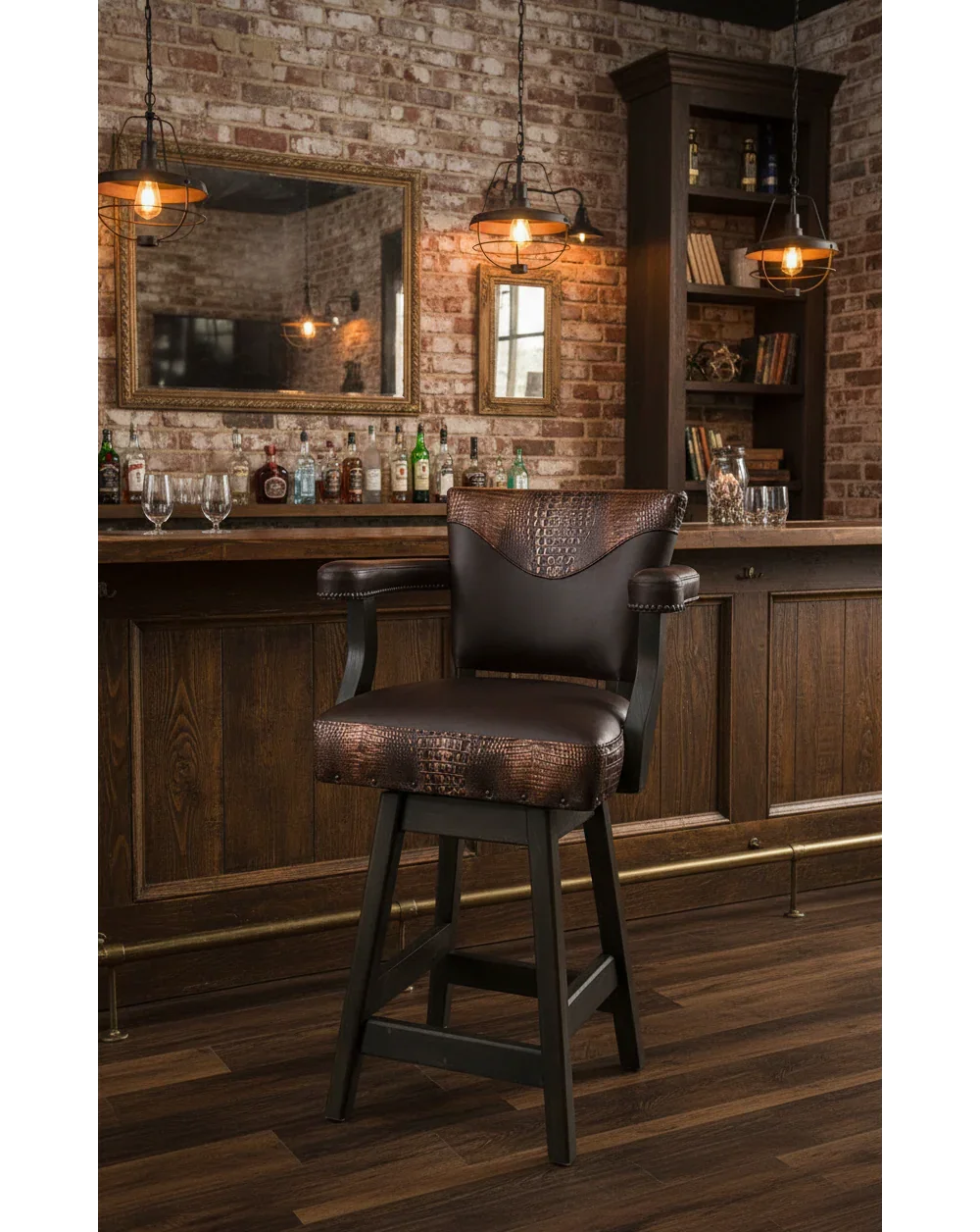 Bring authentic western charm to your space with this stunning barstool, where premium hardwood construction meets eye-catching design. The distinctive copper croc-embossed accents adorning the boxing, yoke, and seat back create a bold visual statement, while the rich mocha upholstery provides sophisticated contrast. Perfect for adding personality and durability to your kitchen, bar, or dining area, this piece seamlessly blends rustic appeal with refined craftsmanship.