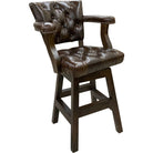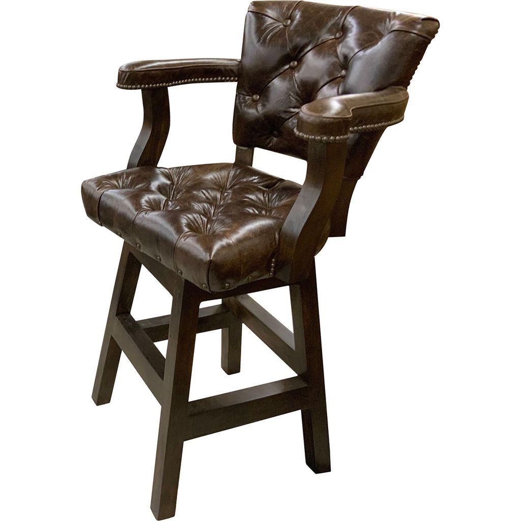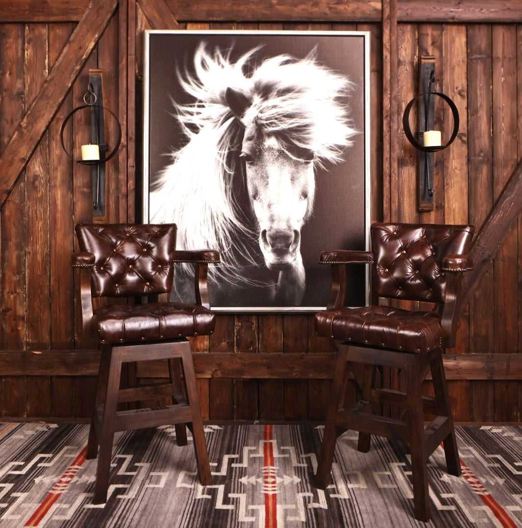 Discover authentic Western style with our Refined Rustic Living Bar Stool, expertly crafted right here in America. Each stool showcases hand-tufted Galveston Vintage leather on the seat and backrest, delivering both visual appeal and superior comfort. Available in bar and counter heights with smooth 360-degree swivel functionality, these stools transform upscale game rooms, man caves, and professional bars into inviting gathering spaces. The meticulous attention to detail and premium materials ensure lasting durability and timeless elegance that complements any sophisticated interior.