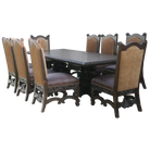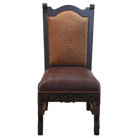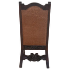 This exquisite handcrafted dining chair features a tall back without armrests, topped with a gracefully curved rail. Its wooden base showcases intricate, hand-carved floral designs on every side, supported by elegantly curved front legs and subtly angled back legs connected by stylish crossbars. The back panel also displays detailed floral carvings. The seat is padded and covered in rich brown full-grain leather, while the backrest sides boast embossed, crocodile-patterned leather. Hand-tacked with decorative nails, this chair is crafted from premium sustainable wood and offers full customization to suit your style.