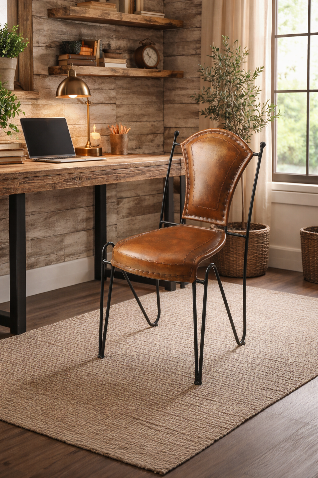 The Angled Iron & Leather Accent Chair is a striking blend of sculptural design and everyday function. Crafted to stand apart, this specialty chair brings a refined modern rustic presence to offices, dining spaces, and accent settings alike.