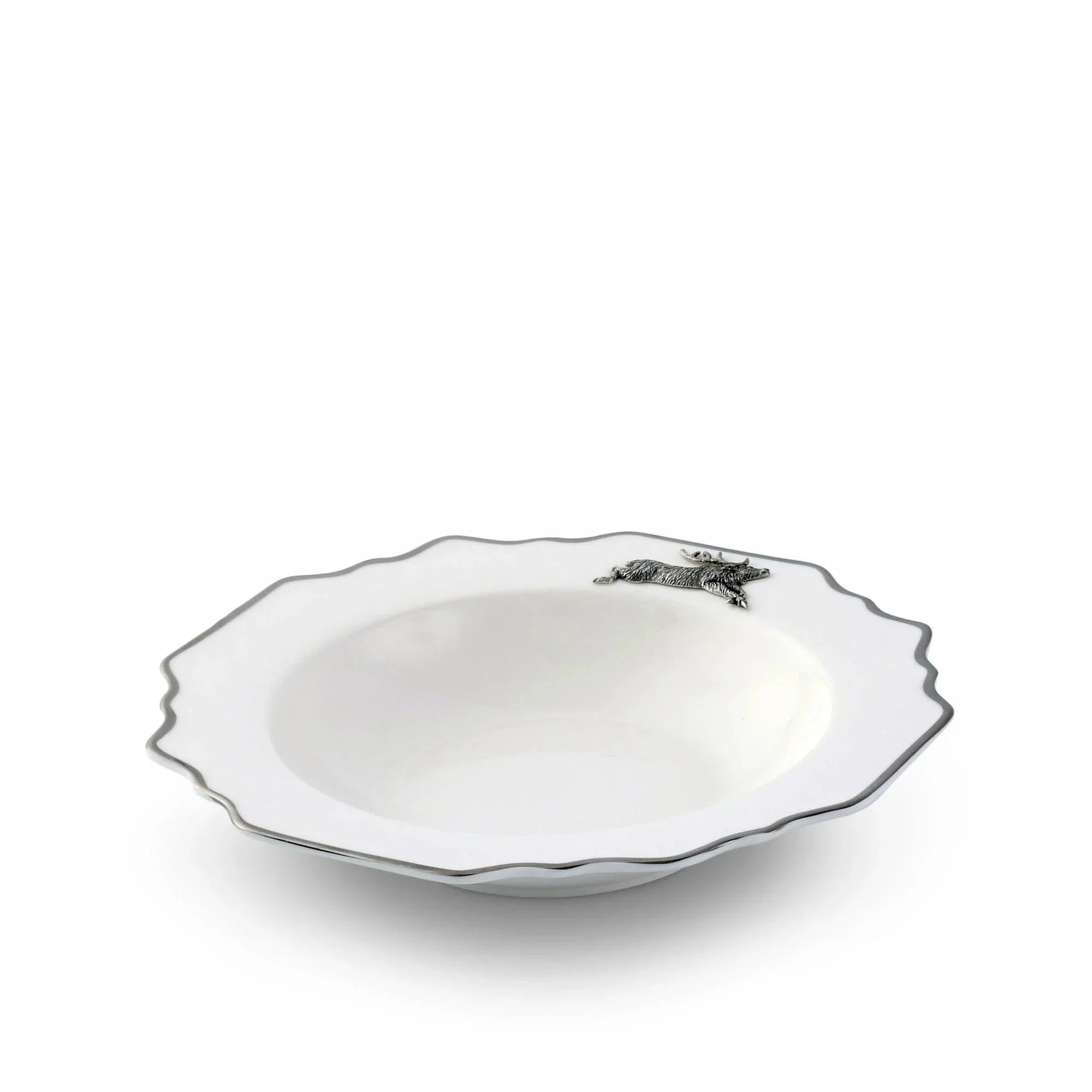 Enhance your china cabinet with the luxurious addition of our exclusive silver running elk bone china dinnerware, boasting platinum rings and scalloped edges. The stylish elk design makes this dinnerware the ideal accompaniment to any modern-rustic table setting.