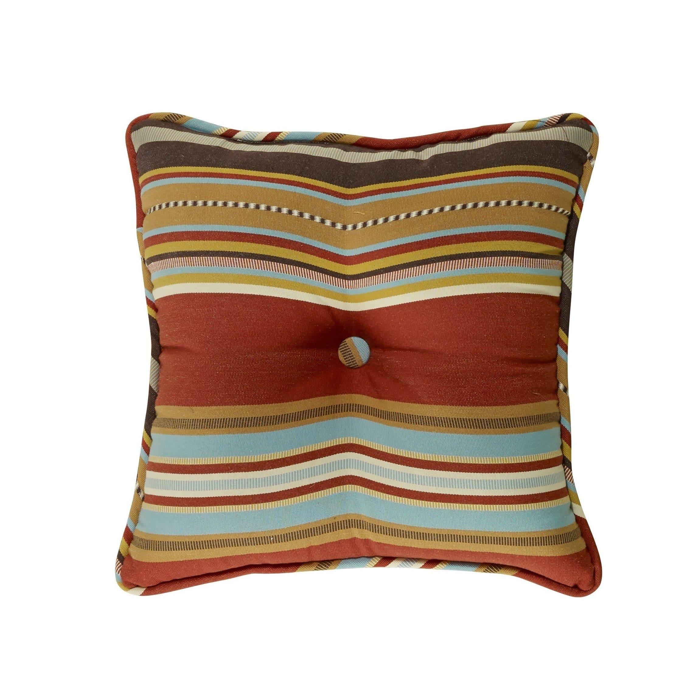 This Calhoun tufted pillow features Southwestern multi-colored serape-inspired stripes and coordinating piping. Additional pieces are available separately. Measures 18" X 18". Hidden zipper closure. Imported.