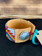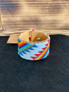 Add a pop of colors to your wrist with our Red & Blue Mountains Bracelet. This hand loom crafted bracelet features a rainbow triangular pattern on a white background. Handmade in the USA, this beautiful piece adds a touch of Western charm to your jewelry collection.