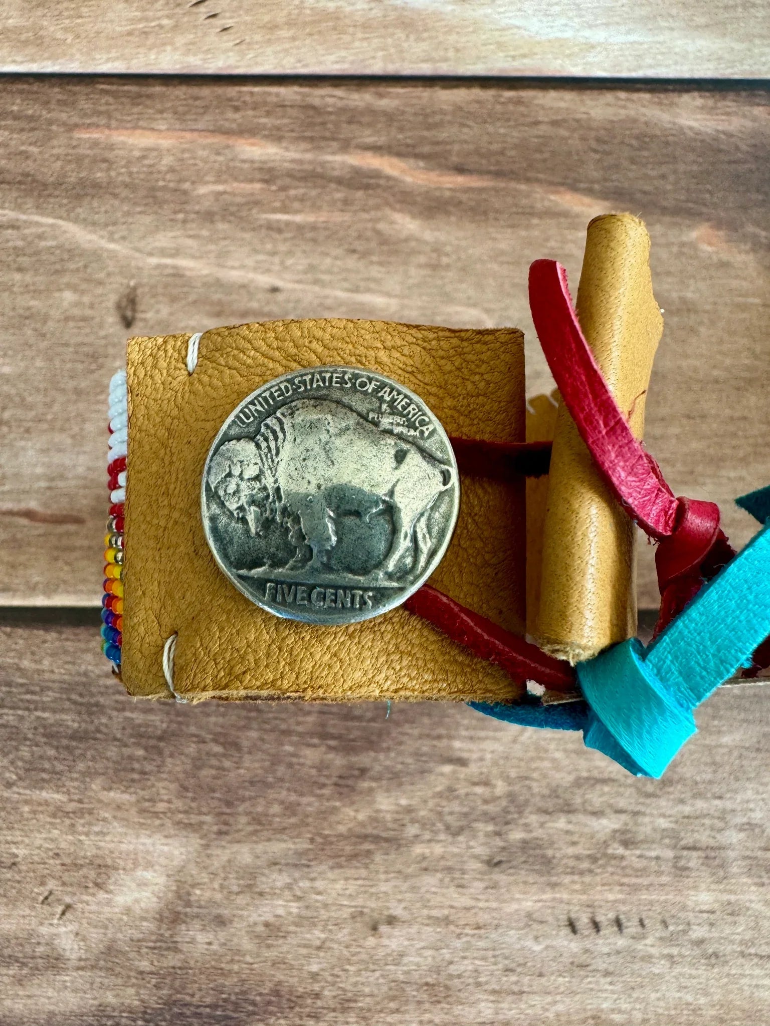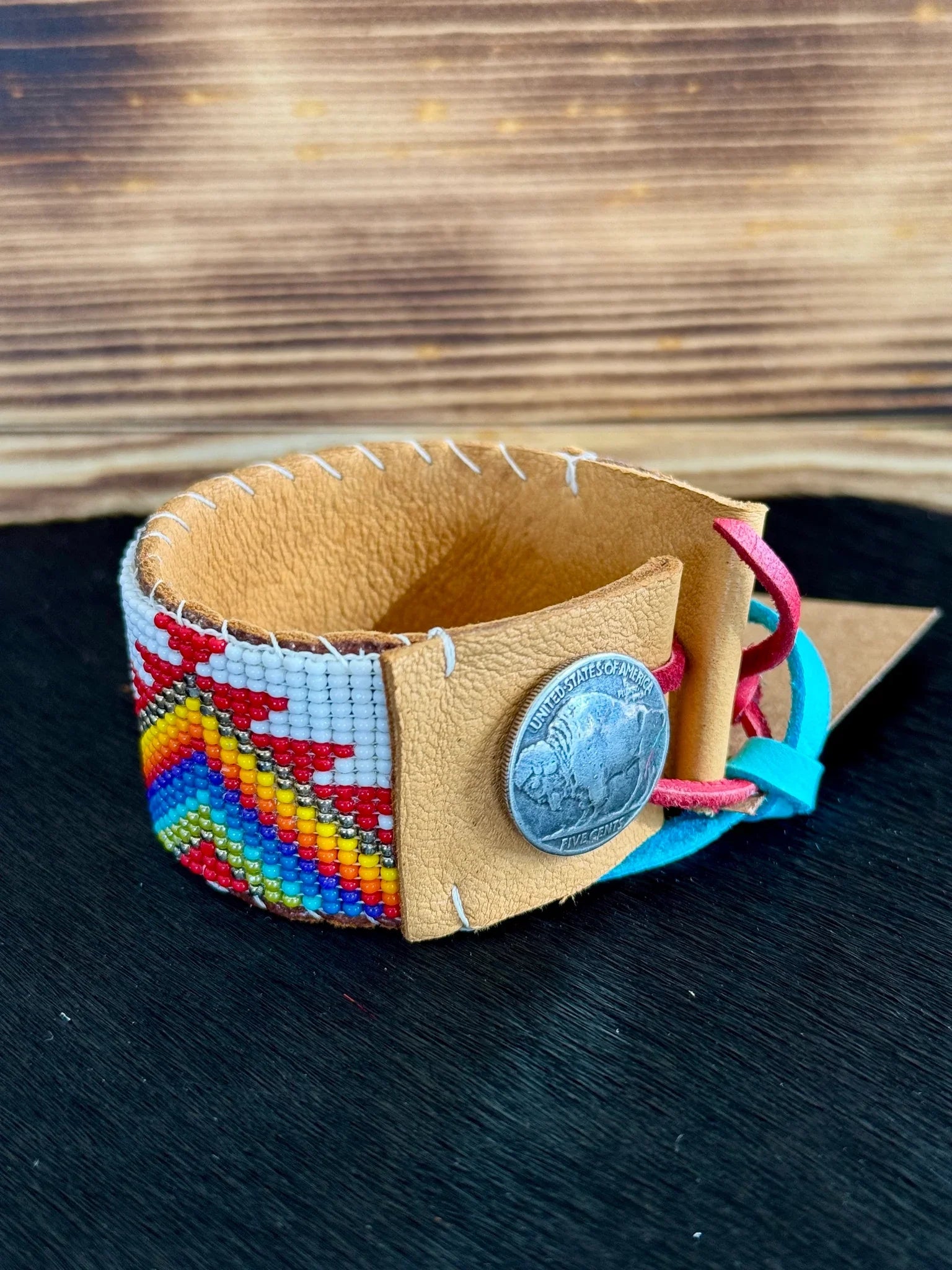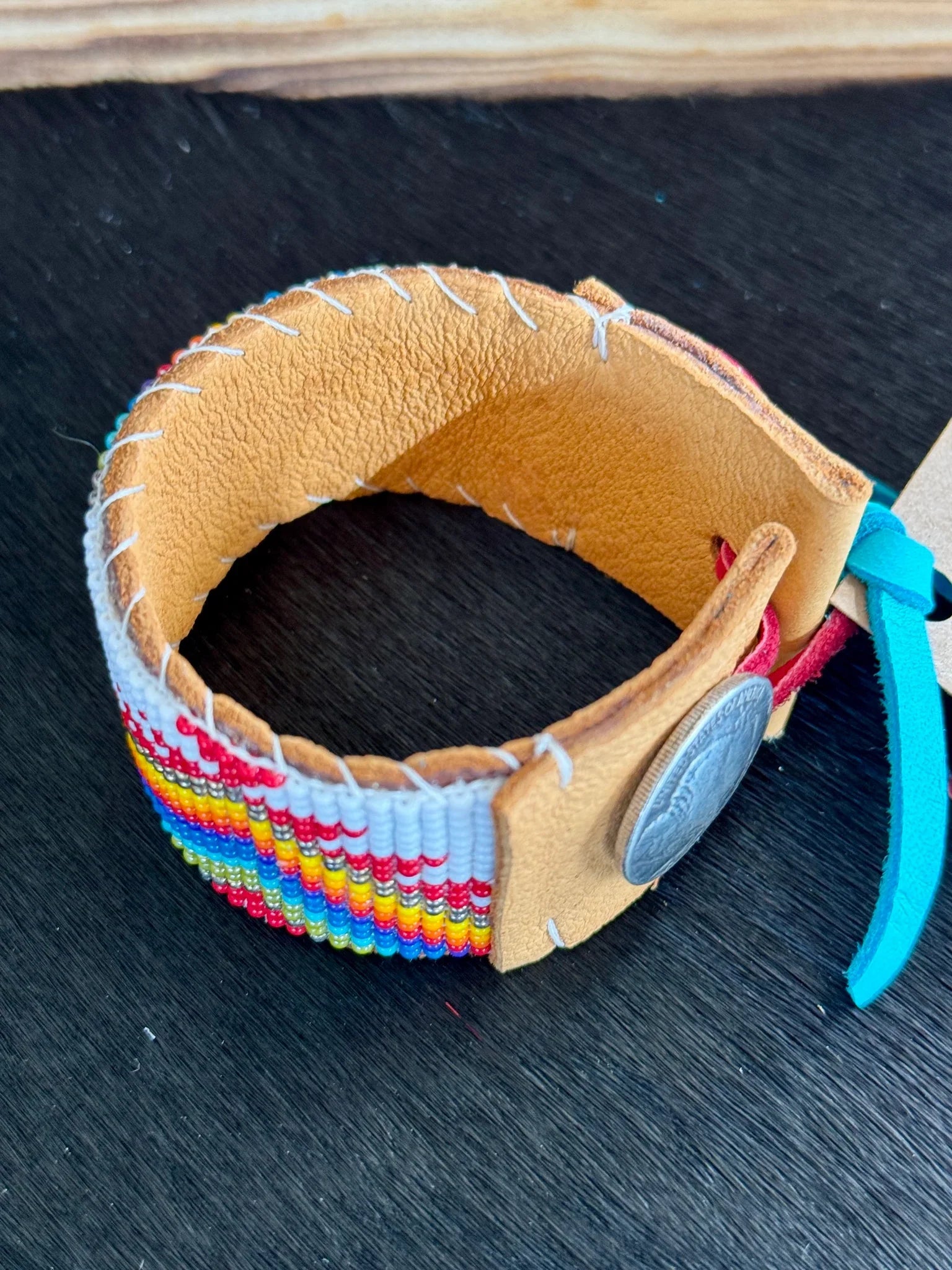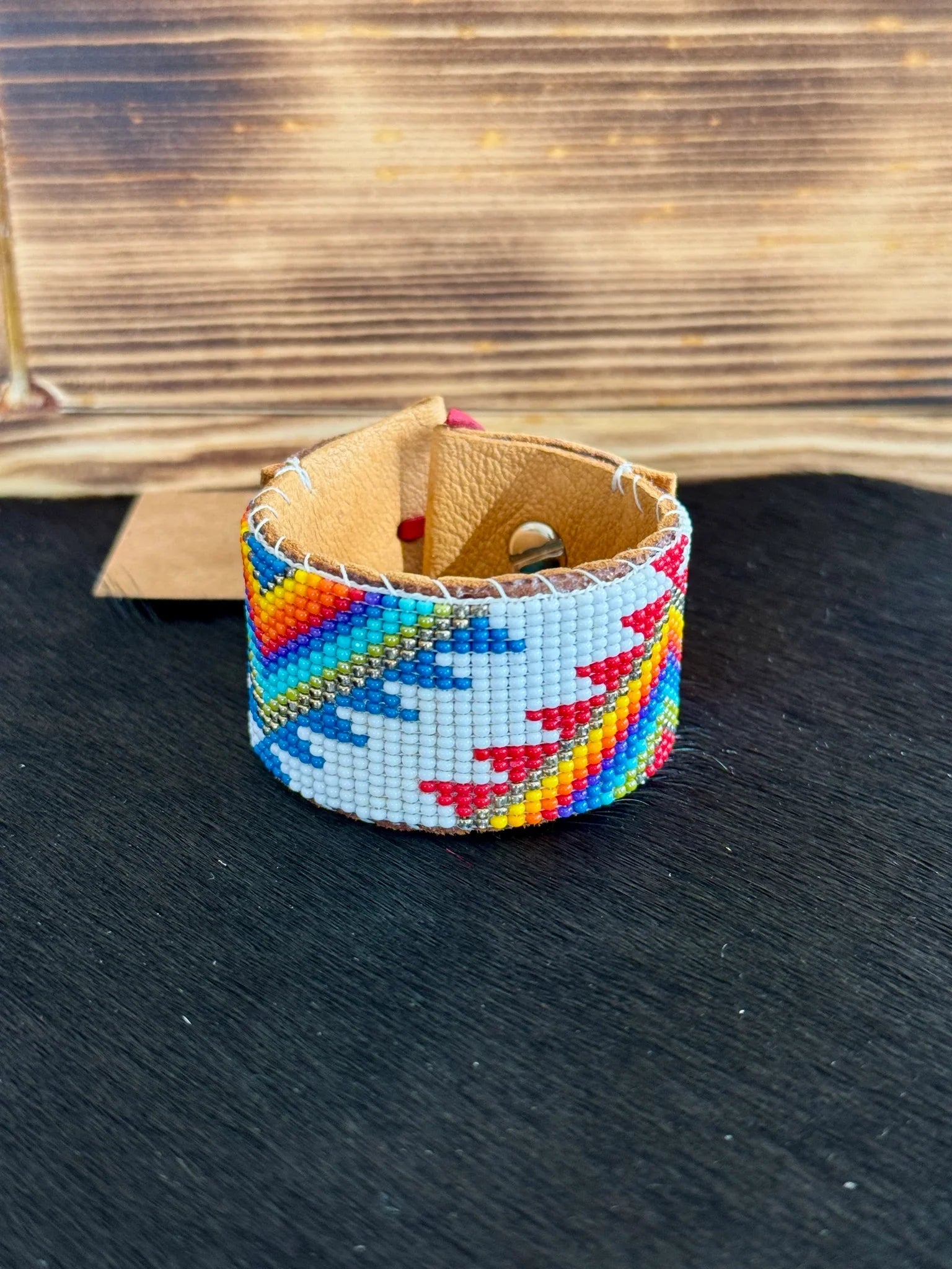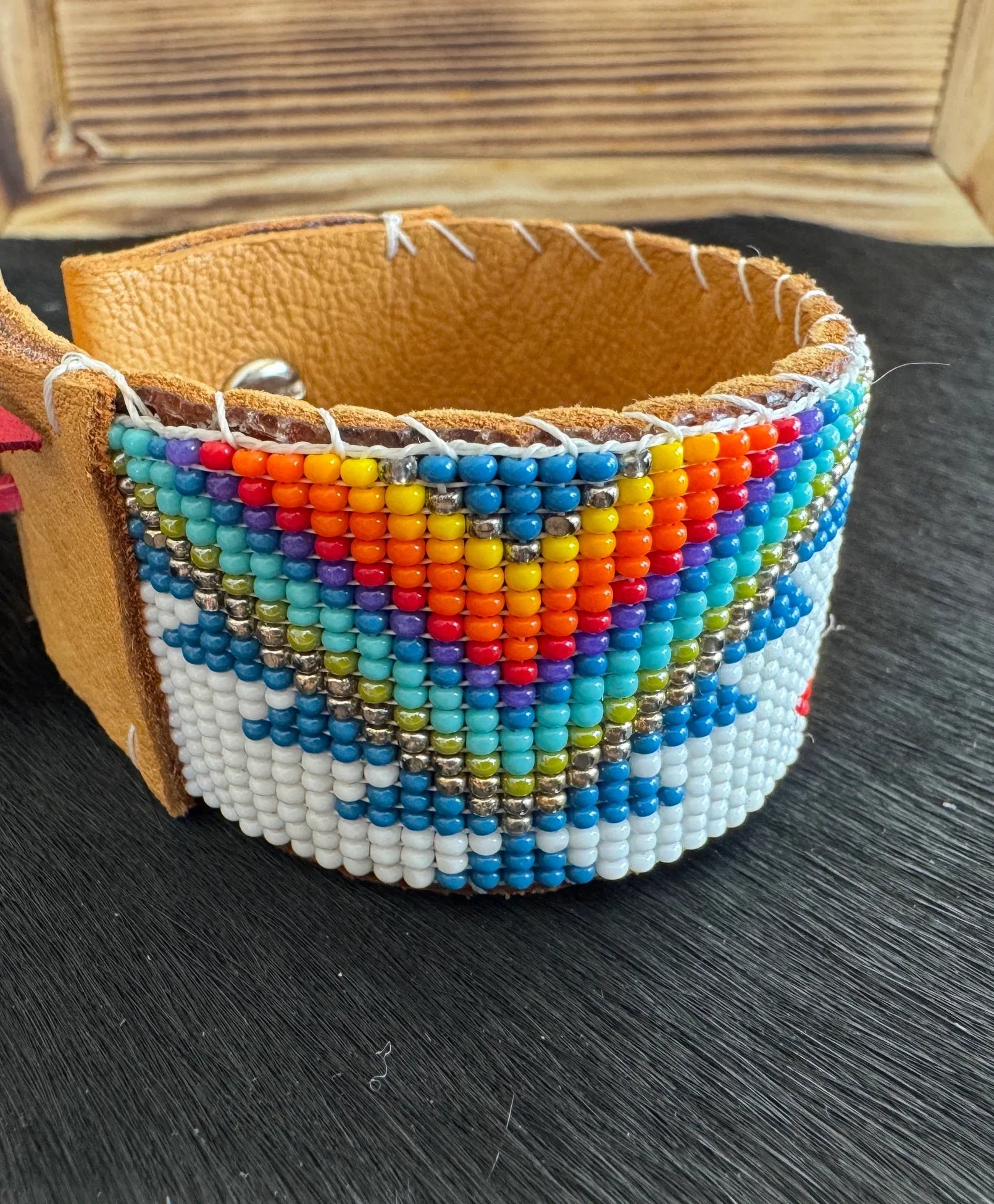Process: Liz begins by drawing up her designs & putting together the perfect colors. She then beads the design using a loom. The loom beaded piece is glued to the leather strip that is cut out to perfectly for the beading. Once the glue is dry, she hand stitches the bead piece to the leather, & folds over the leather ends, finalizing by gluing then stitching the ends. The final step is to attach the Chicago screw button & the leather loop on either ends.