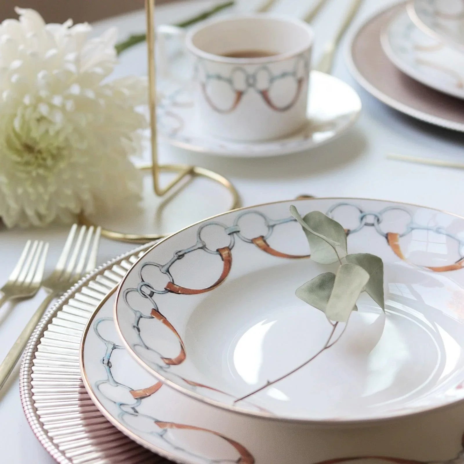 Our Bone China Snaffle Bit Dinnerware Collection puts a sleek twist on the iconic equestrian snaffle bit theme.