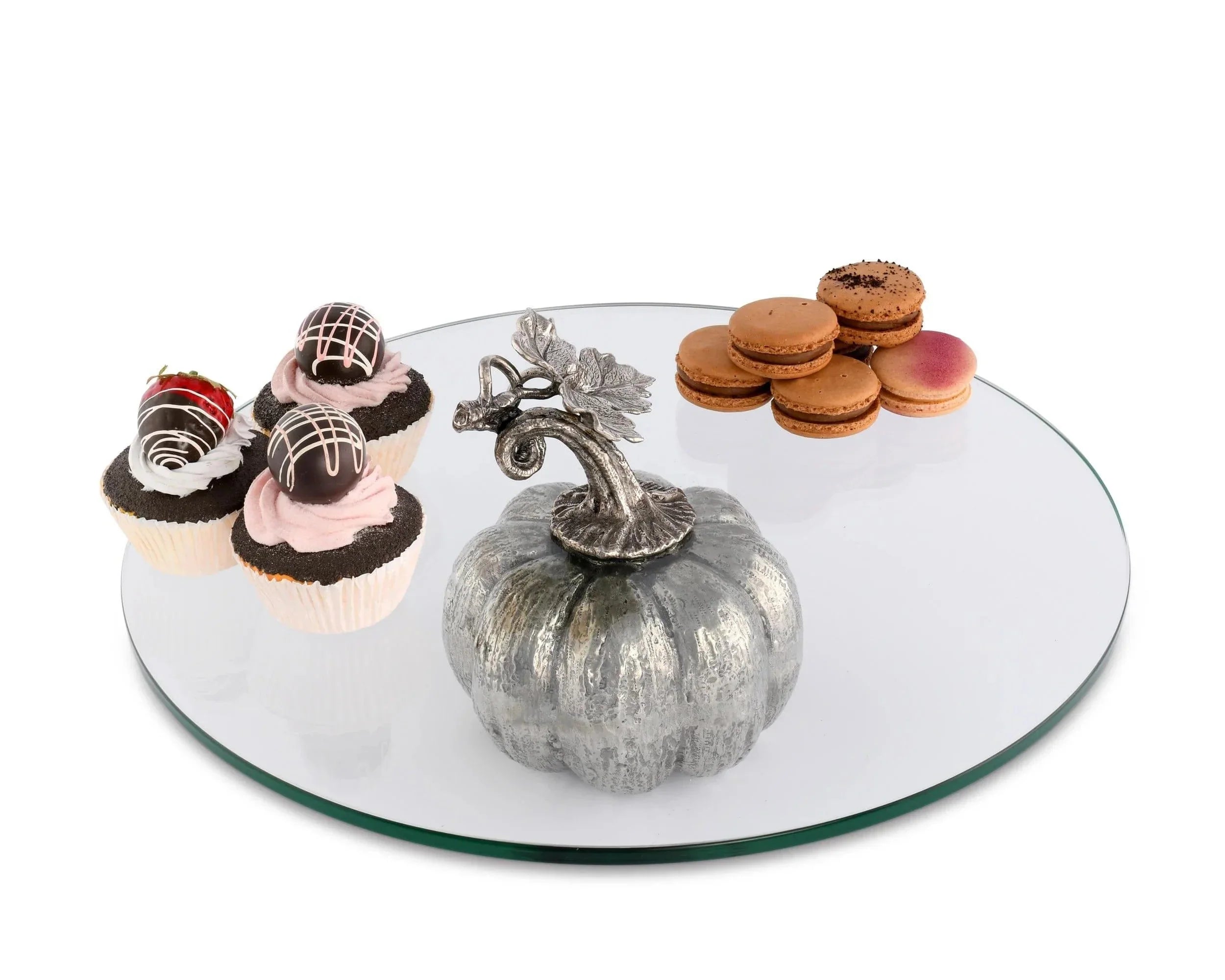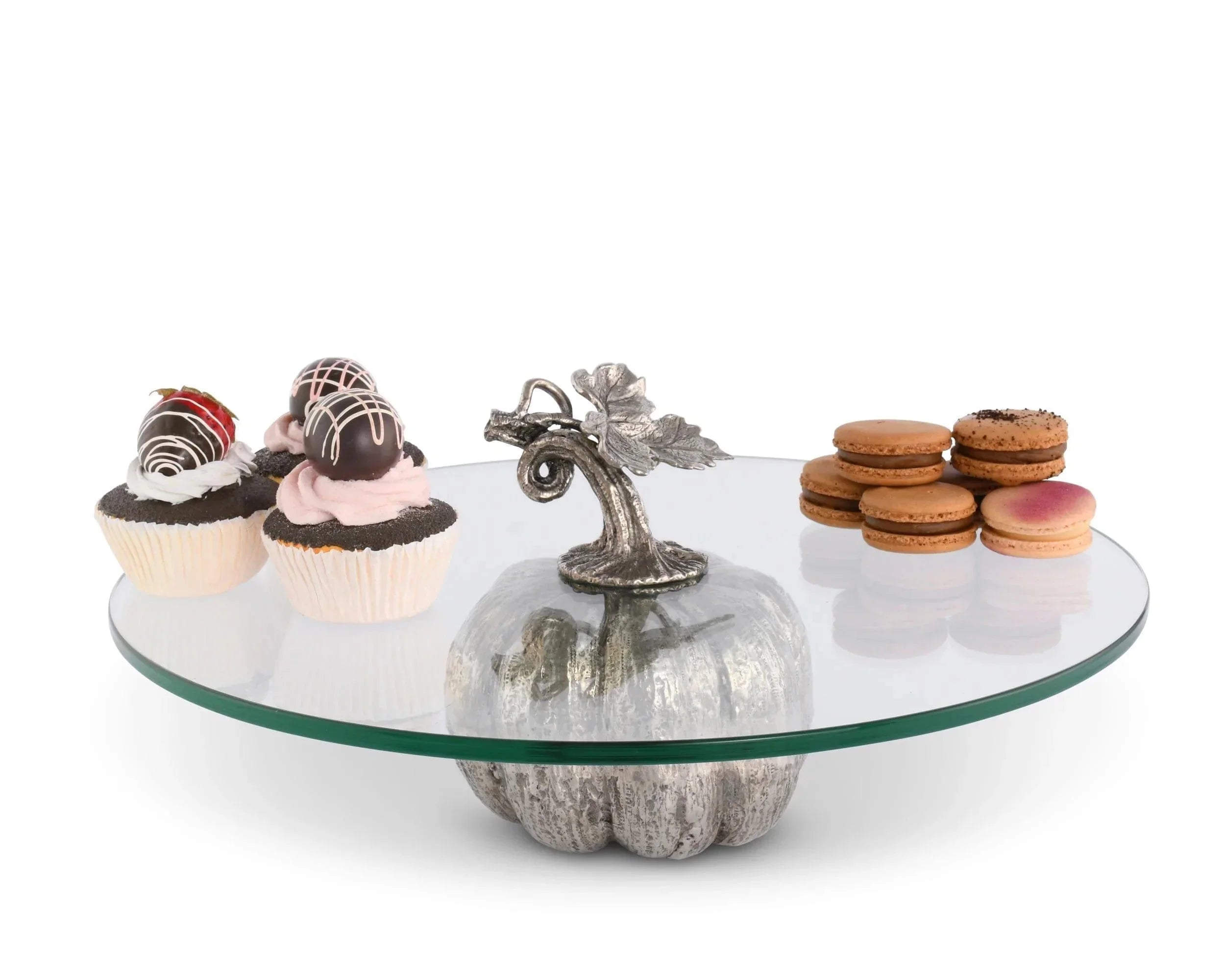 Present your exquisite macarons, cupcakes, or pumpkin spice cookies on this elegant Pewter Pumpkin Dessert Stand. Perfect for autumn gatherings, it beautifully showcases your seasonal treats with a thick, clear glass plate atop a finely crafted pewter baby sugar pumpkin. The intricate vine and stem design artfully melds through the glass, serving as both decoration and a functional handle, making this dessert stand a refined centerpiece for fall entertaining.