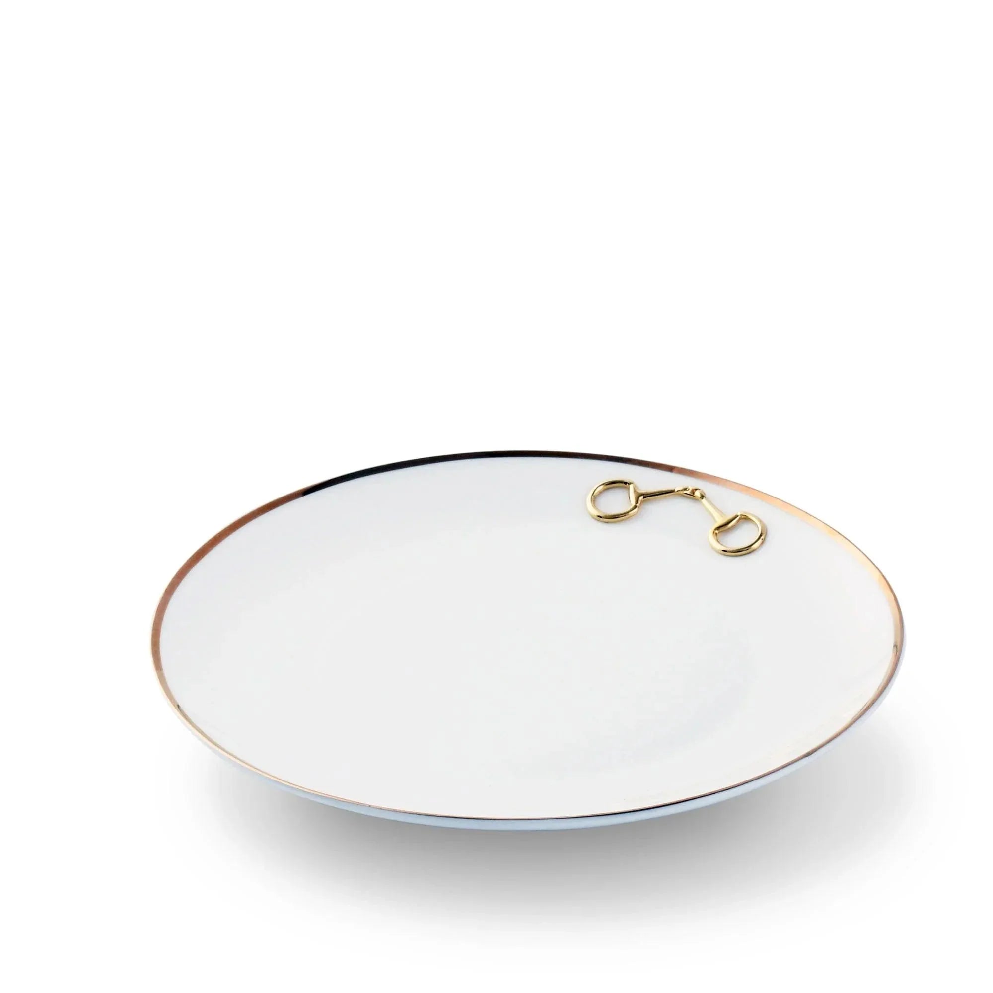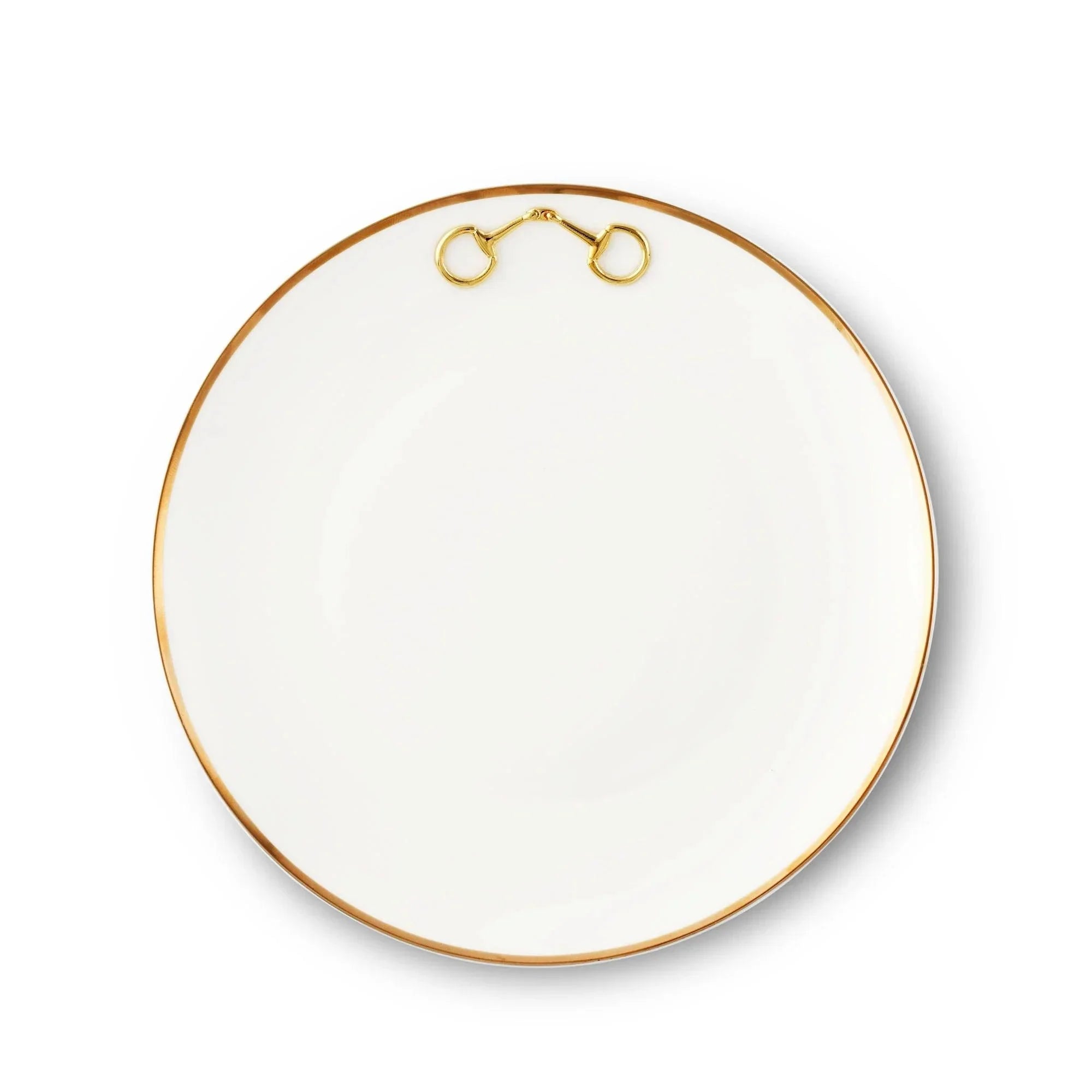 Experience effortless equestrian elegance at your dinner gathering with our Snaffle Bit Gold Salad Plates. Crafted with an intricate and classic snaffle bit design, these salad plates are the perfect way to liven up your celebration. Sophisticated and timeless, these plates are sure to make a unique statement with the gold accents. Crafted from bone china with a distinctive hand made gold rim & pewter snaffle bit.
