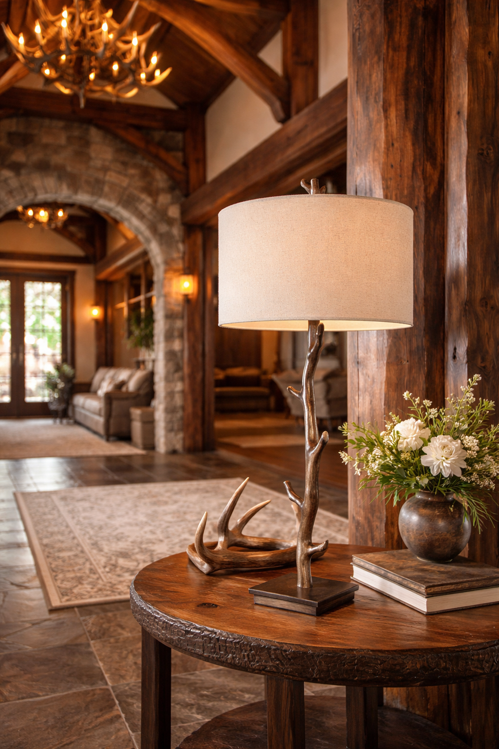 Resembling a tree branch, this rustic-modern Bronzed Branch Lamp is the perfect lighting choice for a modern or lodge space in need of some rustic elegance. This tall table lamp is finished in a dark bronze with gold undertones. The lamp includes an oatmeal linen lamp shade that offers a natural light slubbing.