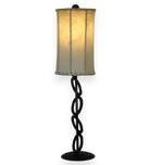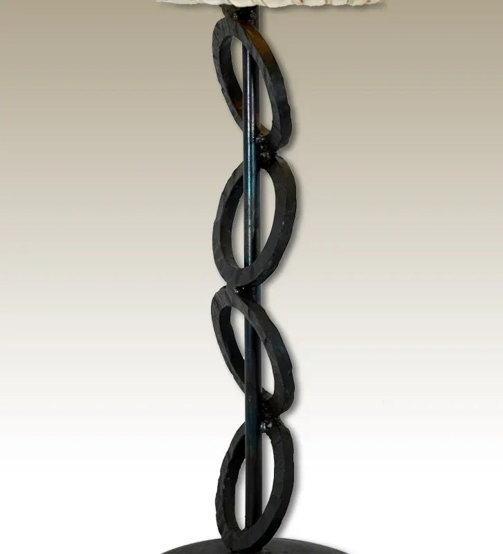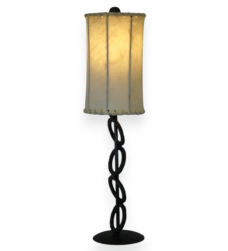 The Elliott Chain Link Table Lamp features a base crafted from hand-forged recycled iron, inspired by the design of linked chains. Its dark finish lends a refined rustic charm to any room. Available as a base only or paired with your choice of seven dyed rawhide shades, this lamp offers a tasteful way to customize your rustic or western décor.