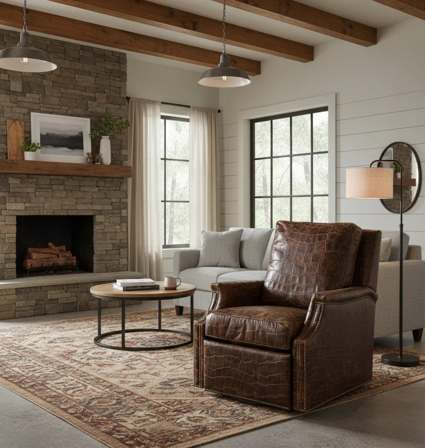 The Nile Leather Swivel Recliner exudes rustic sophistication with its distinctive croc-embossed leather. This western-inspired executive swivel chair combines classic design and natural touches, making it an ideal addition to a heritage-style home with rustic charm.