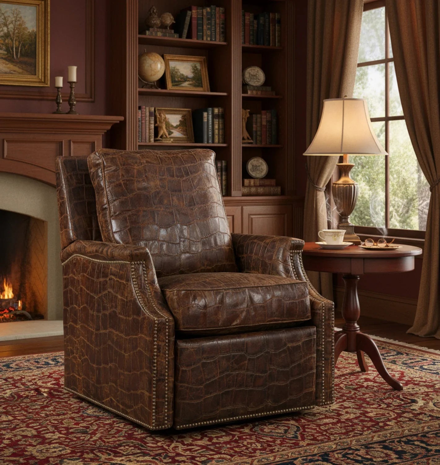Crafted by hand from soft, croc-embossed leather and supported by a robust base, this custom-made chair showcases designs rooted in enduring tradition. Combining functionality with lasting quality, it promises to be a cherished heirloom for years to come. Elevate your space with the refined comfort of the Nile Swivel Leather Recliner.