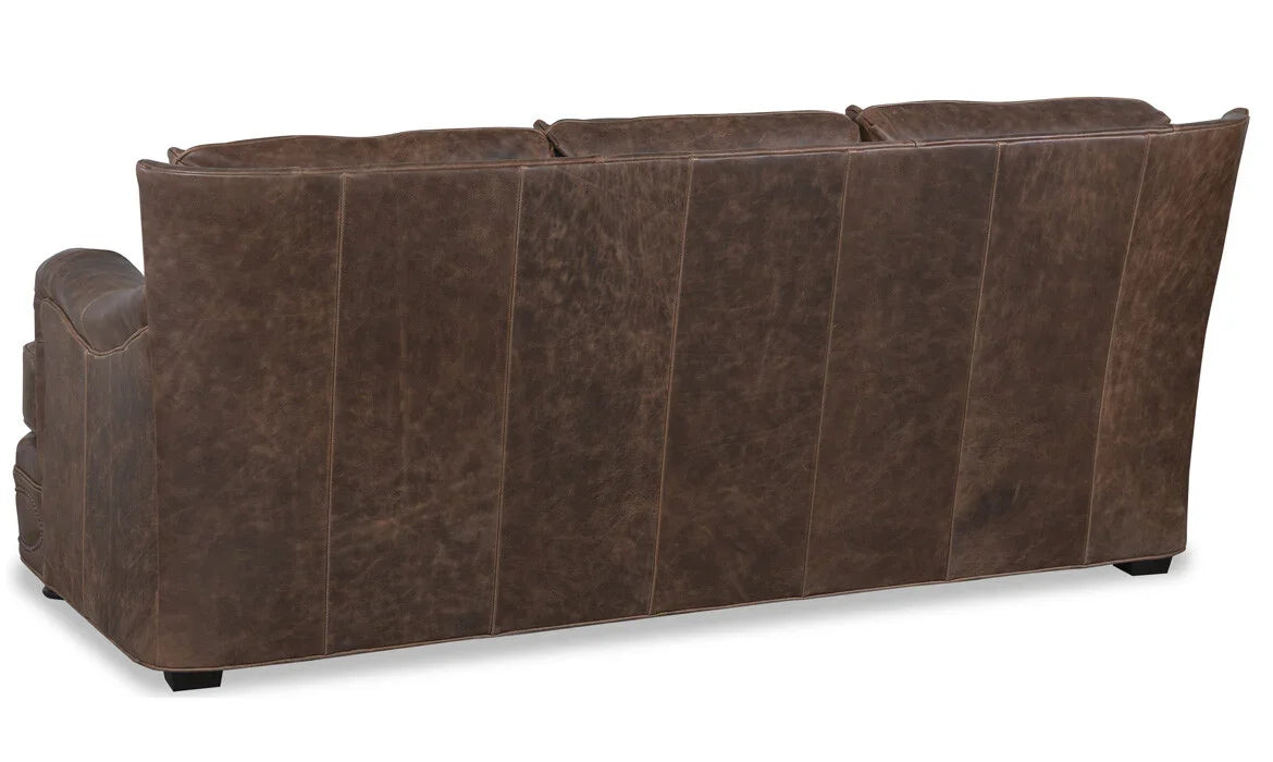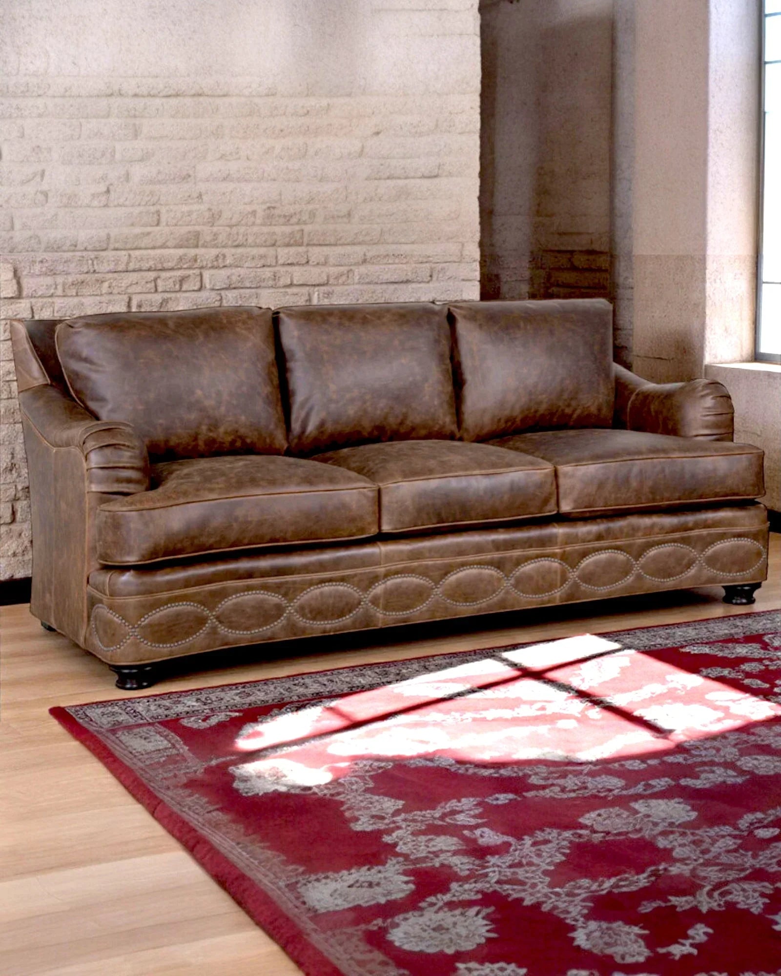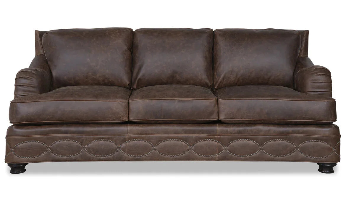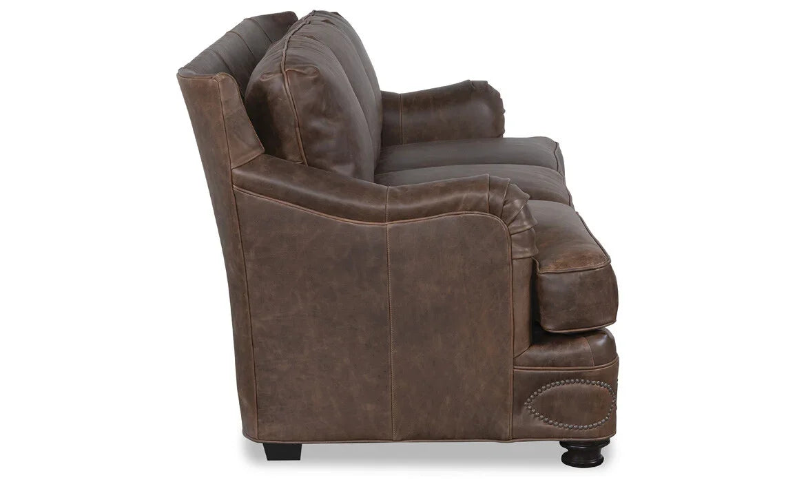 The Fort Worth Leather Collection, featuring a chair, ottoman, sofa, and loveseat, is designed to transform any room into your favorite retreat. Each piece boasts a generous size, softly curved barrel back, and padded English arms for superior comfort. The distinctive nail head trim forms an elegant wave pattern, adding a touch of sophistication. Upholstered in the rich, silky Arruza Tortoise waxy aniline leather, this collection also complements any of our other leather or fabric choices. With a sleek, understated design that captures Western elegance and expert 8-way hand-tied craftsmanship, it delivers lasting comfort and durability.