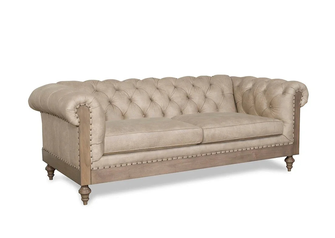 The Yellowstone Chesterfield Leather Sofa is framed by polished, exposed wood that exudes richness and sophistication. This sofa’s timeless leather presence requires no elaborate praise—it naturally commands attention. Generously deep for comfortable lounging with additional cushions, it maintains an elegant balance without dominating the space.