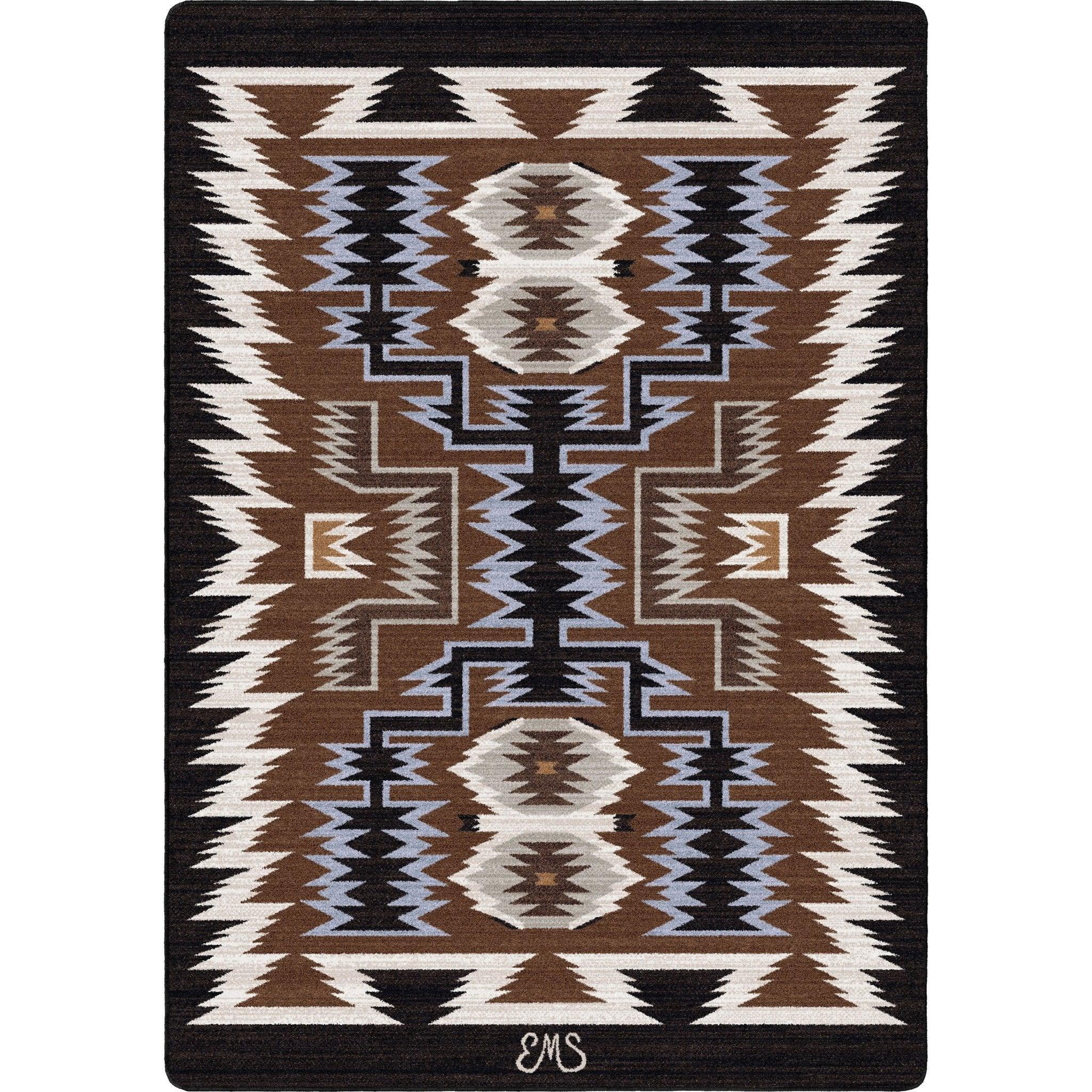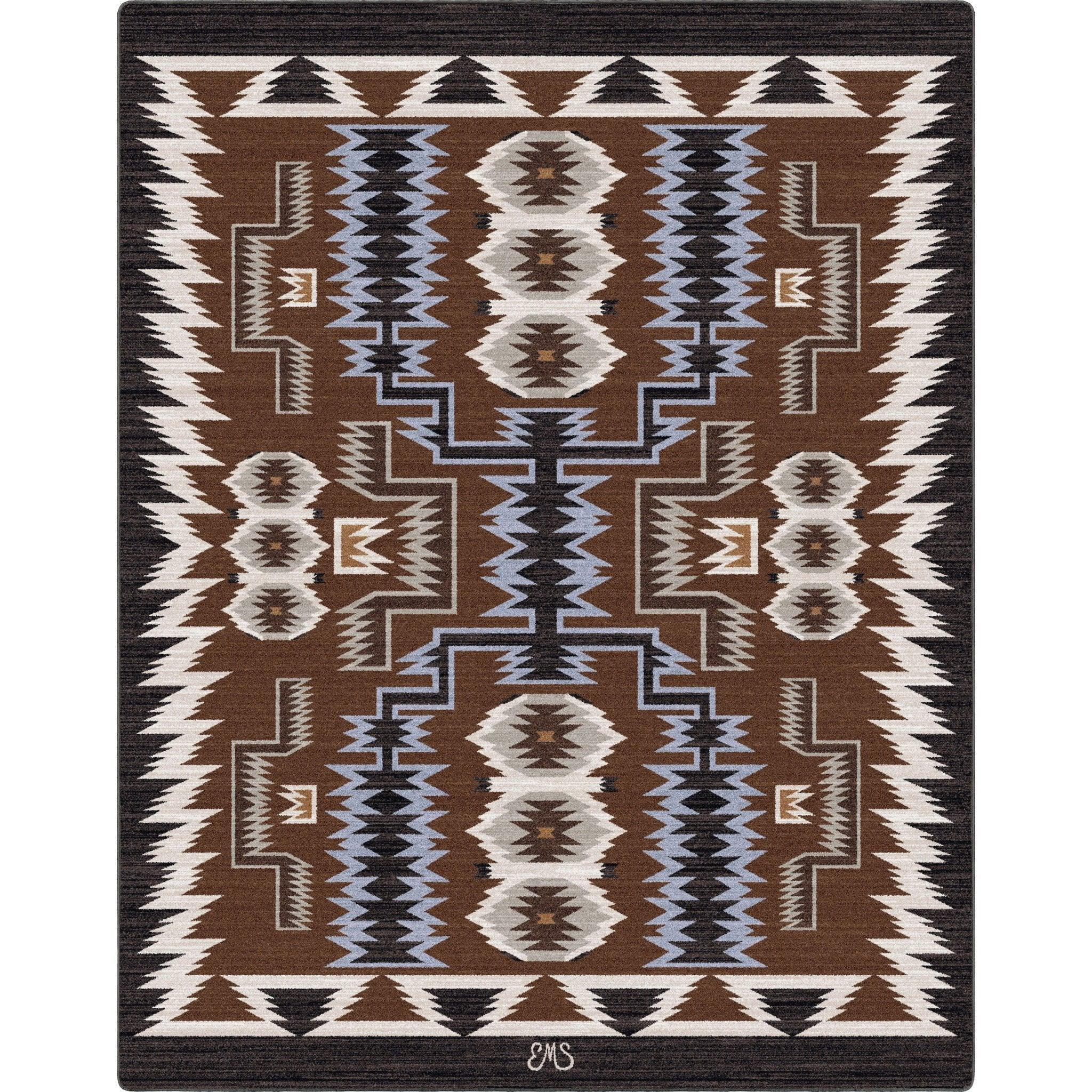 Add a touch of Native American culture to your home with the Beauty of Rain Rug Collection. Featuring a black edging, brown, tan & baby blue this commercial-grade rug is made in the USA and designed by artist Eugenia Stanley. Bring beauty and tradition into your space!