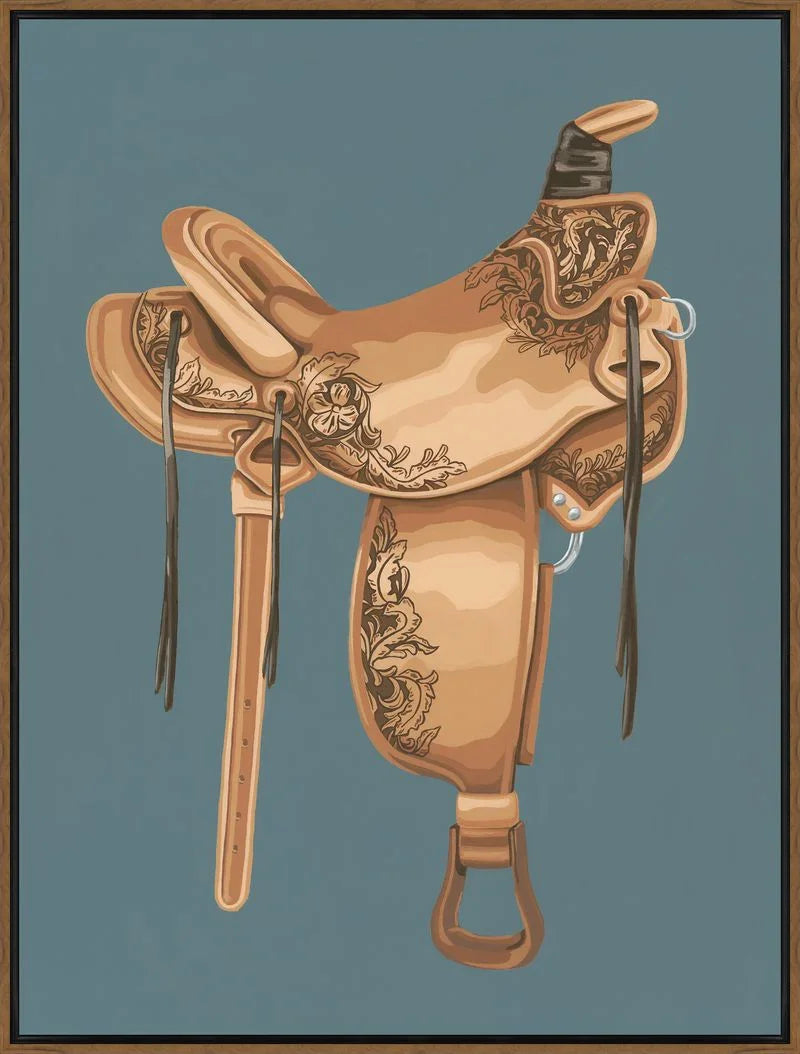 Elevate your space with the captivating Framed Western Saddle Art. Showcasing a meticulously crafted western saddle set against a soft dusty sky blue backdrop, this vertical artwork is housed in a rustic oak frame that marries refined elegance with genuine western character. Ideal for your living room, office, or foyer, it effortlessly complements any decor style. Bring home this stunning piece to infuse your environment with timeless craftsmanship and a touch of western sophistication.