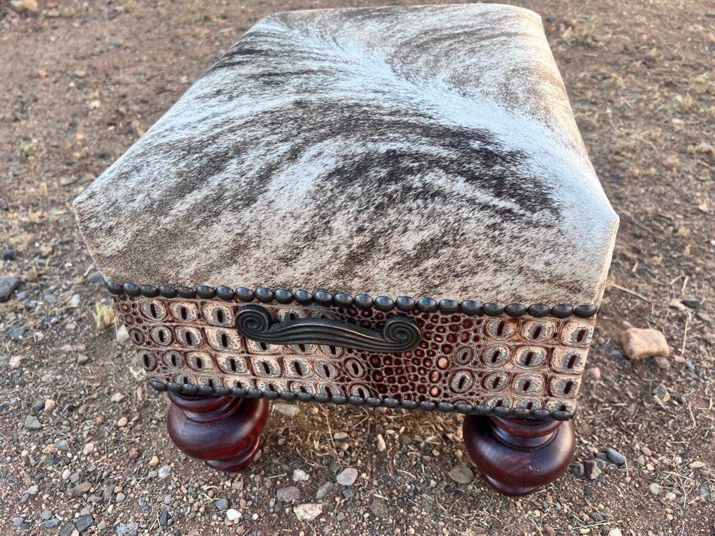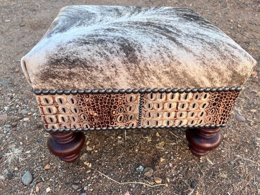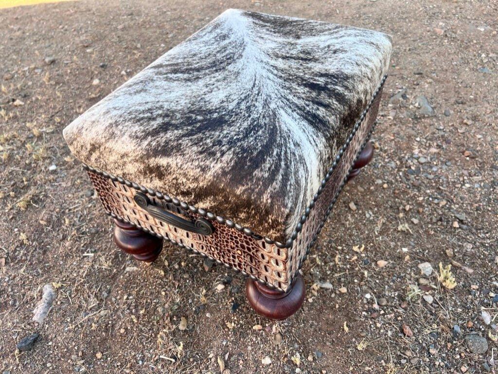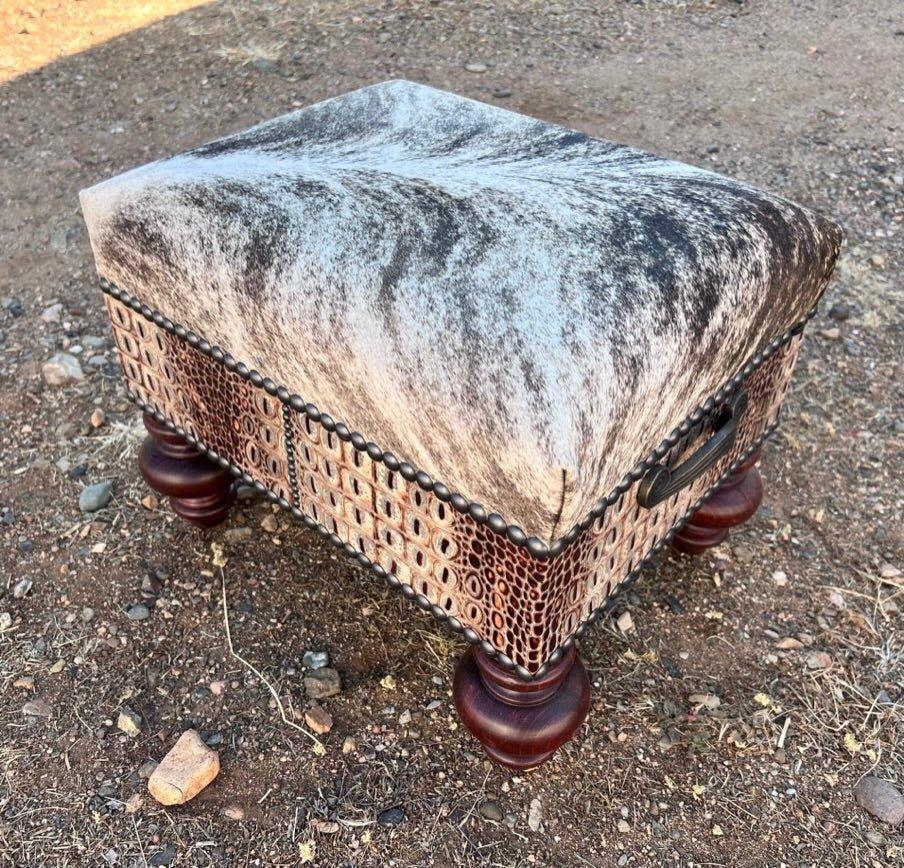 Crafted with both light brindle cowhide and croc embossed leather, our Cowhide & Croc Leather Ottoman brings a touch of sophistication to your living area. This ottoman or footstool can be used as a comfortable place to kick up your feet, or as an extra seat when needed. Its enchanting presence provides a luxurious allure to any interior.