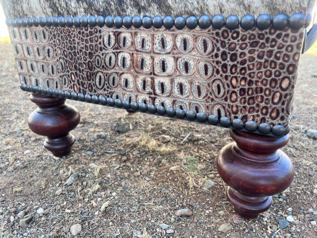 Elevate your living space with the Cowhide & Croc Leather Ottoman. Its light brindle cowhide top will provide a luxurious spot to rest your feet or sit, while its sides are crafted with rich Bayou croc embossed leather and snapped croc patterns for an exquisite look. Enjoy durable and comfortable cushioning with its high density foam, and bask in its luxurious style.